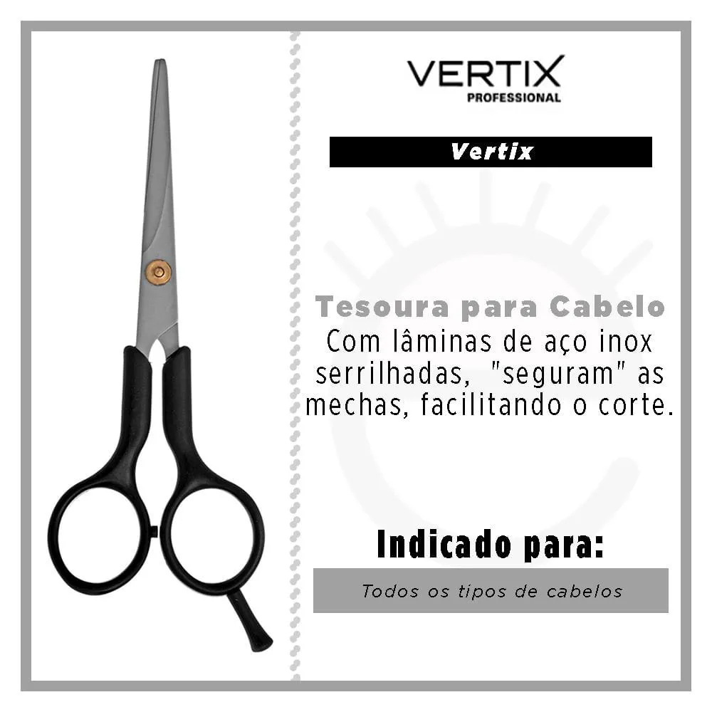 A Tesoura para cabelo Vertix tem tamanho 5,5 polegadas e é ideal para iniciantes que precisam de uma tesoura que confira mais segurança no corte. Sua lâmina possui fio serrilhado (laser) que segura a mecha de cabelo e evita que ela escorregue pela tesoura.