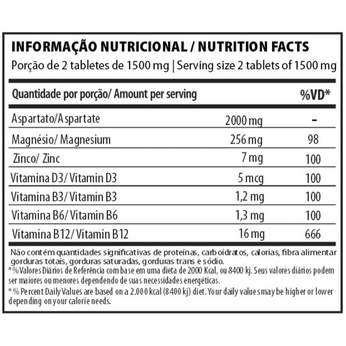 Aspartato (ácido aspártico), Sulfato de magnésio, Aspartato de zinco, vitamina B12 (Cianocobalamina), Vitamina B6, (Cloridrato de Piridoxina), Vitamina B3 (Nitrato de Tiamina), Vitamina D3 (Colecalciferol), antiumectantes carbonato de cálcio e dióxido de silício. NÃO CONTÉM GLÚTEN.