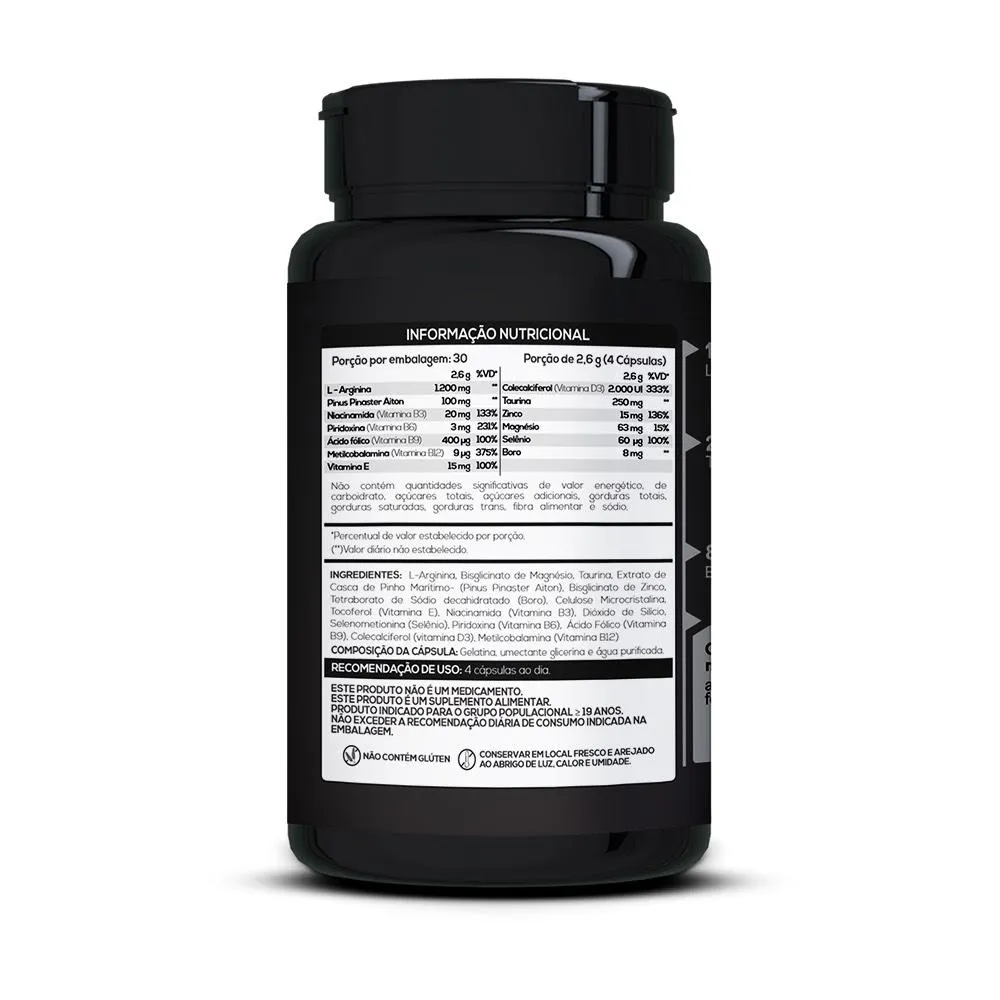 O suplemento contém aminoácidos (L-arginina, taurina), minerais (magnésio, zinco, boro, selênio), vitaminas (E, D3, B3, B6, B9, B12) e extrato de pinho marítimo. Em conjunto, esses ingredientes: * Ajudam na circulação e energia (arginina, taurina, vitaminas do complexo B); * Oferecem ação antioxidante (vitamina e, selênio, extrato de pinho); * Contribuem para função muscular, imunidade e equilíbrio hormonal (magnésio, zinco, vitamina D3, boro). É um composto voltado para vitalidade, desempenho físico e bem-estar geral. ? Tabela de Informação Nutricional L-Arginina 1.200 mg Pinus Pinaster Extrato Seco 100 mg Vitamina D3 2.000 UI Taurina 250 mg Bisglicinato de Zinco (Zinco) 29 mg Nicotinamida (Vitamina B3) 35 mg Piridoxina (Vitamina B6) 3 mg Ácido Fólico (Vitamina B9) | 400 mcg Metilcobalamina (Vitamina B12) 9.9 mcg Vitamina E 15 mg Bisglicinato de Magnésio (Magnésio) 63 mg Boro 10 mg