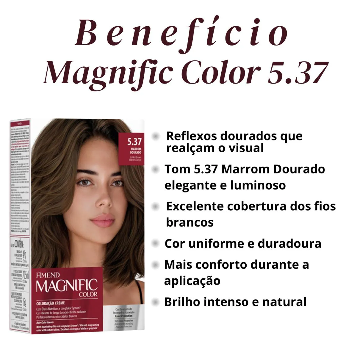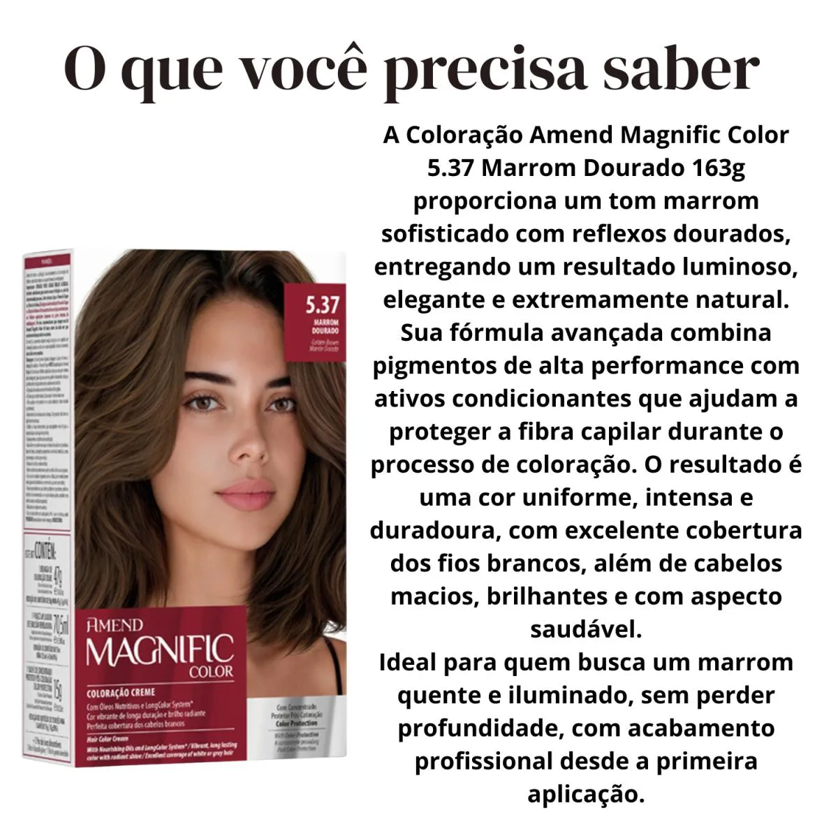 Loja Oficial beleza Marcante A Beleza Marcante Cosméticos é uma loja virtual que, há mais de 8 anos, cuida com carinho da beleza de pessoas modernas e atualizadas. Trabalhamos apenas com produtos 100% originais, nota fiscal, envio rápido e atendimento humanizado. ESTOQUE DISPONÍVEL – ENVIO IMEDIATO – ENVIAMOS PARA TODO O BRASIL – NOTA FISCAL – FOTOS REAIS – DIRETO DA FÁBRICA • Loja Oficial na plataforma • 8+ anos entre os melhores vendedores • Atendimento humanizado • Variedade completa de produtos de qualidade • Entrega rápida e segura • Compras 100% seguras Este anúncio contém: 1 unidade – Amend Magnific Color Coloração 5.37 Marrom Dourado 163g Descrição Geral A Coloração Amend Magnific Color 5.37 Marrom Dourado foi desenvolvida para quem busca cor intensa, sofisticada e com brilho absoluto, aliando performance profissional ao cuidado com os fios. Sua fórmula avançada proporciona cobertura uniforme, inclusive dos fios brancos, enquanto trata a fibra capilar durante o processo químico. O tom Marrom Dourado 5.37 entrega um resultado quente, elegante e luminoso, valorizando o visual com profundidade e reflexos dourados naturais. Com textura cremosa e fácil de aplicar, a Magnific Color garante um resultado duradouro, com fios macios, hidratados e com aspecto saudável desde a primeira aplicação. Benefícios • Cor intensa e duradoura • Tom Marrom Dourado sofisticado e luminoso • Cobertura uniforme dos fios brancos • Brilho intenso e toque sedoso • Tratamento durante a coloração • Resultado profissional • Fácil aplicação • Cabelos macios e com aparência saudável Modo de Uso Misture a coloração conforme instruções da embalagem. Aplique nos cabelos secos e não lavados, iniciando pela raiz. Distribua uniformemente pelo comprimento e pontas. Deixe agir pelo tempo indicado na embalagem. Enxágue bem até a água sair clara e finalize como desejar. Importante: Realize sempre o teste de mecha antes da aplicação. Indicação • Indicado para quem deseja colorir os cabelos com alto desempenho • Ideal para quem busca tons quentes e elegantes • Uso profissional ou doméstico, seguindo corretamente as instruções Como conservar • Manter fora do alcance de crianças • Conservar em local fresco e ao abrigo de luz intensa • Não ingerir • Em caso de contato com os olhos, enxaguar imediatamente com água abundante • Uso externo FAQ – Perguntas Frequentes 1. Cobre fios brancos? Sim. Proporciona excelente cobertura quando aplicada corretamente. 2. O tom puxa mais para o dourado ou marrom? É um marrom equilibrado com reflexos dourados quentes e sofisticados. 3. A coloração resseca os fios? A fórmula contém agentes condicionantes que ajudam a manter maciez e brilho. 4. Precisa de oxidante? Sim. O oxidante deve ser utilizado conforme orientação da embalagem (vendido separadamente). 5. Pode ser usada em cabelos quimicamente tratados? Recomenda-se sempre o teste de mecha para avaliar compatibilidade.