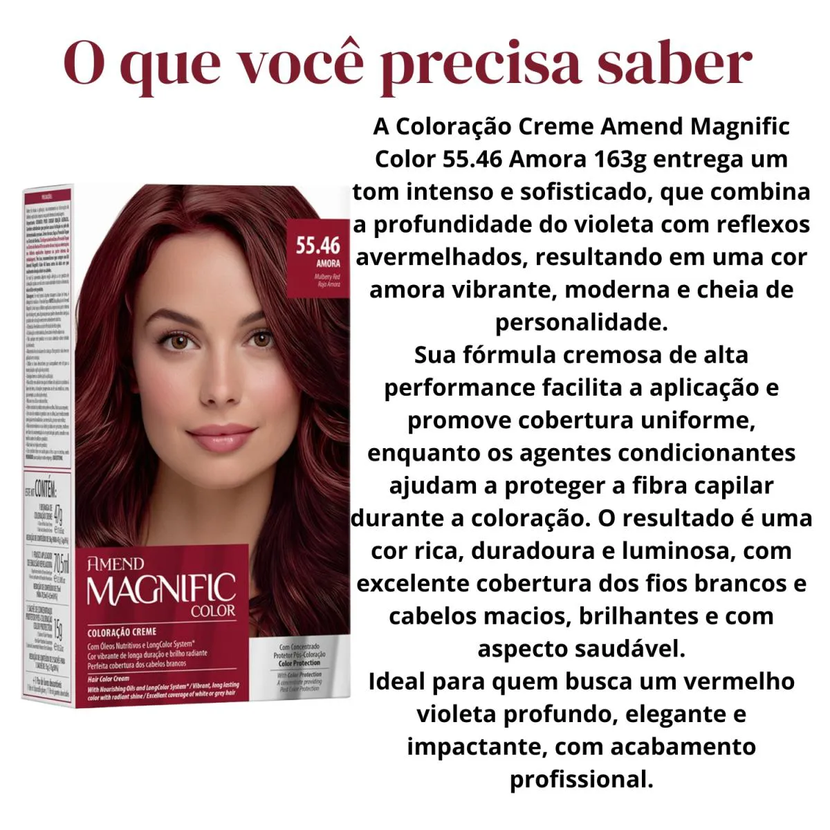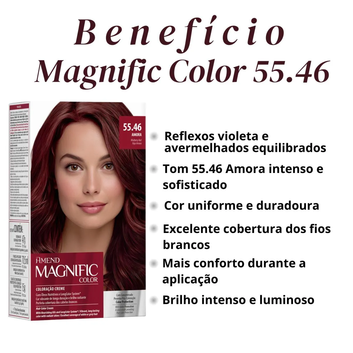 Loja Oficial beleza Marcante A Beleza Marcante Cosméticos é uma loja virtual que, há mais de 8 anos, cuida com carinho da beleza de pessoas modernas e atualizadas. Trabalhamos apenas com produtos 100% originais, nota fiscal, envio rápido e atendimento humanizado. ESTOQUE DISPONÍVEL – ENVIO IMEDIATO – ENVIAMOS PARA TODO O BRASIL – NOTA FISCAL – FOTOS REAIS – DIRETO DA FÁBRICA • Loja Oficial na plataforma • 8+ anos entre os melhores vendedores • Atendimento humanizado • Variedade completa de produtos de qualidade • Entrega rápida e segura • Compras 100% seguras Este anúncio contém: 1 unidade – Amend Magnific Color Coloração 55.46 Amora 163g Descrição Geral A Coloração Amend Magnific Color foi desenvolvida para quem busca cor intensa, sofisticada e com brilho absoluto, aliando performance profissional ao cuidado com os fios. Sua fórmula avançada proporciona cobertura uniforme, inclusive dos fios brancos, enquanto trata a fibra capilar durante o processo químico. Com textura cremosa e fácil de aplicar, a Magnific Color garante um resultado duradouro, com fios macios, hidratados e com aspecto saudável desde a primeira aplicação. Benefícios • Cor intensa e duradoura • Cobertura uniforme dos fios brancos • Brilho intenso e toque sedoso • Tratamento durante a coloração • Resultado profissional • Fácil aplicação • Cabelos macios e com aparência saudável Modo de Uso Misture a coloração conforme instruções da embalagem. Aplique nos cabelos secos e não lavados, iniciando pela raiz. Distribua uniformemente pelo comprimento e pontas. Deixe agir pelo tempo indicado na embalagem. Enxágue bem até a água sair clara e finalize como desejar. Importante: Realize sempre o teste de mecha antes da aplicação. Indicação • Indicado para quem deseja colorir os cabelos com alto desempenho • Ideal para quem busca tons quentes e elegantes • Uso profissional ou doméstico, seguindo corretamente as instruções Como conservar • Manter fora do alcance de crianças • Conservar em local fresco e ao abrigo de luz intensa • Não ingerir • Em caso de contato com os olhos, enxaguar imediatamente com água abundante • Uso externo FAQ – Perguntas Frequentes 1. Cobre fios brancos? Sim. Proporciona excelente cobertura quando aplicada corretamente. 2. A coloração resseca os fios? A fórmula contém agentes condicionantes que ajudam a manter maciez e brilho. 3. Pode ser usada em cabelos quimicamente tratados? Recomenda-se sempre o teste de mecha para avaliar compatibilidade.