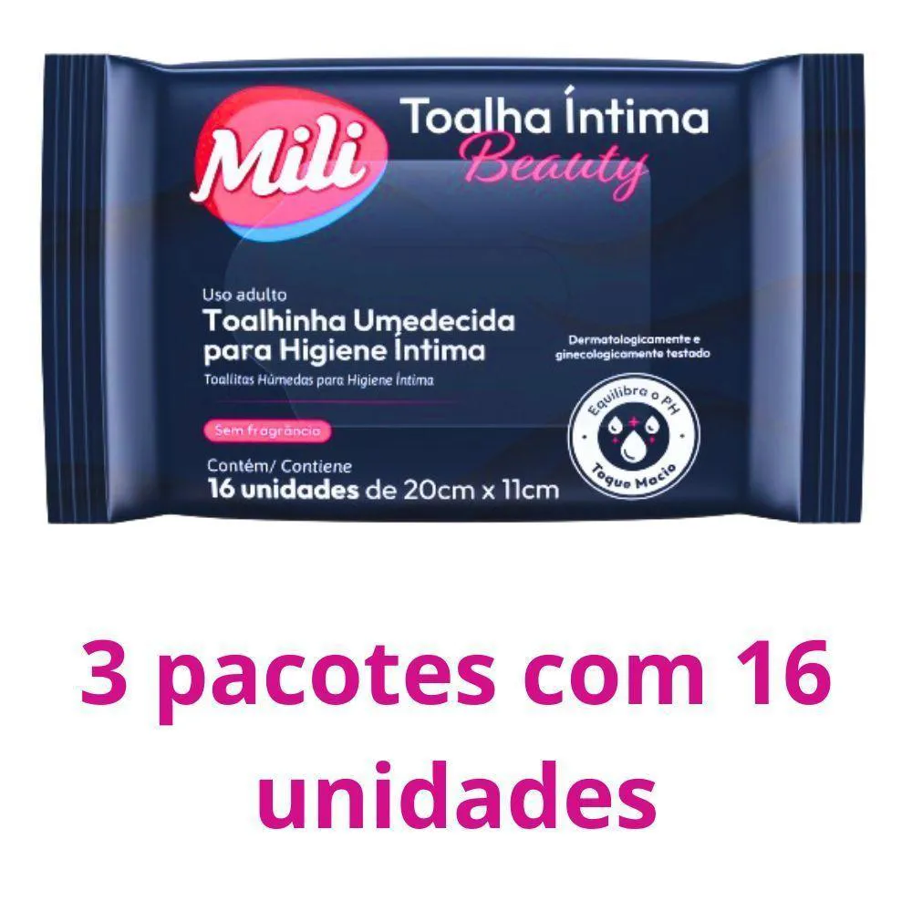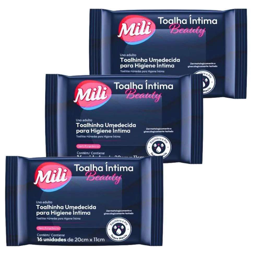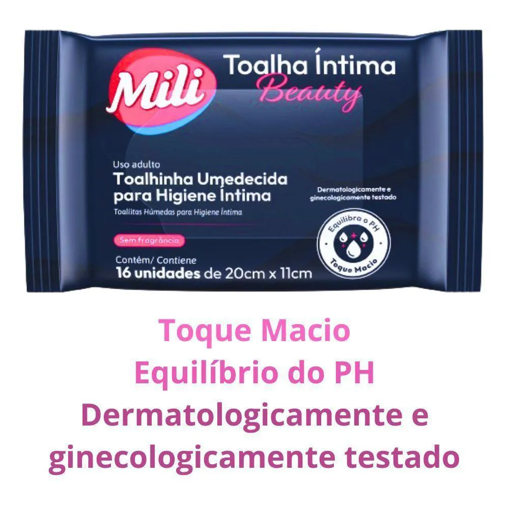 Toalha Íntima Beauty - Toalhinha Umedecida p/ Higiene ÍntimaMarca: Mili3 pacotes com 16 unidades de 20x11cm (total: 48 toalhinhas)Toalhinha Umedecida para Higiene Íntima - uso adultoPH EquilibradoDermatologicamente e ginecologicamente testadoSuper macioCom extrato natural de chá branco e ácido lácticoFórmula a base de águaHipoalérgicaAção antioxidanteProduto não oleoso