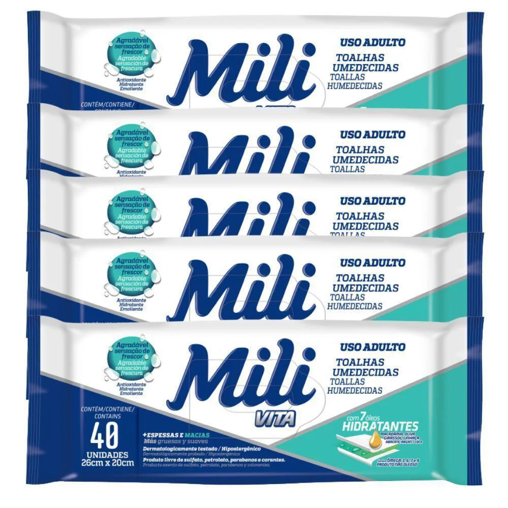 Toalha Umedecida Mili Vita/ lenço umedecido Uso Adulto 5 Pacotes C/ 40 Unidades (total 200 Toalhas)