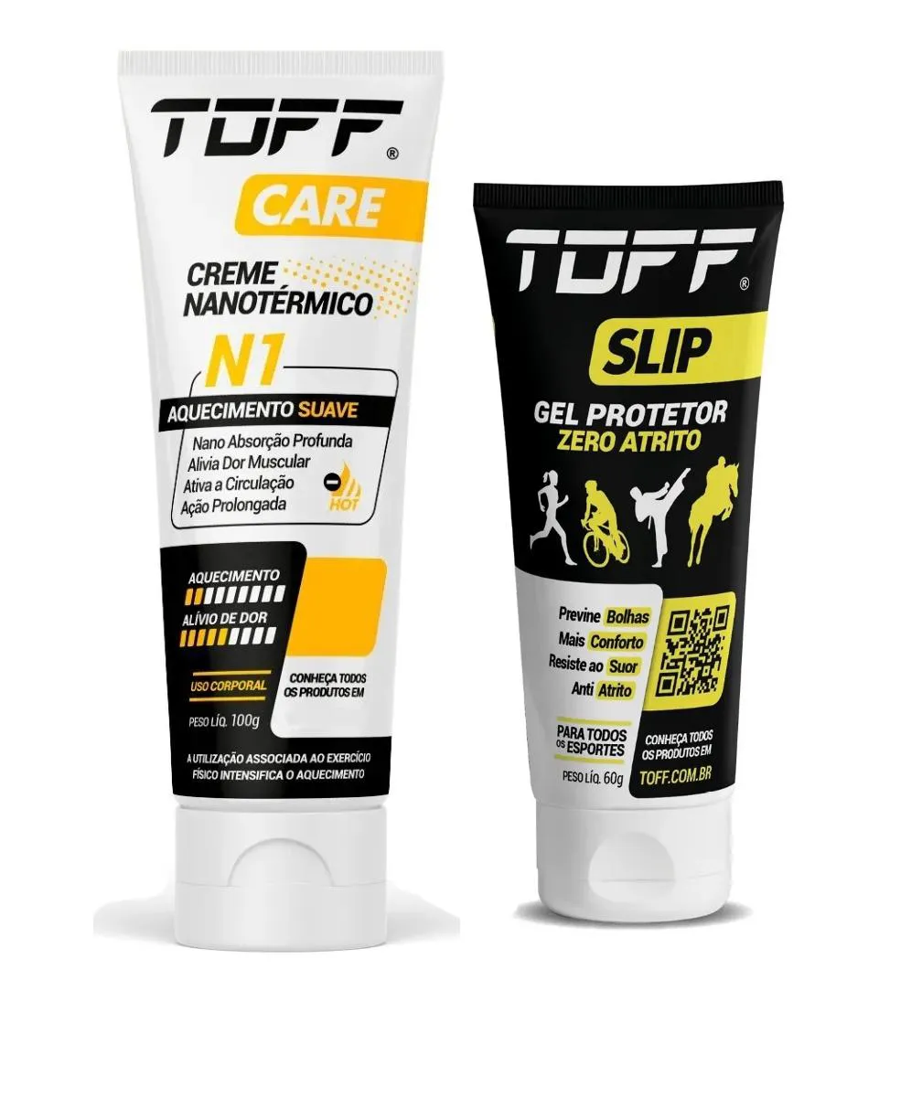 Kit TOFF 1X TOFF CARE N1 100g - Creme NANOTÉRMICO de Aquecimento 1X TOFF SLIP 60G - Creme Antiatrito contra Assadura para Esportes TOFF CARE N1 O TOFF CARE NANOTÉRMICO N1 é um creme terapêutico desenvolvido com nanotecnologia cosmética que facilita a absorção profunda dos nanoativos funcionais responsáveis por aliviar a dor muscular. A formula também possui ativos térmicos com efeito sensorial exclusivo que proporcionam um prolongado aquecimento da derme e promovem o aumento da vascularização no local da lesão, acelerando o processo de recuperação muscular. INDICAÇÃO