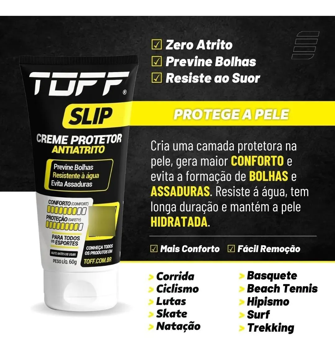 É indicado como uma forma de tratamento tópico de dores musculares provenientes de fadiga, enrijecimento, distensão ou inflamação que se apresentam em forma de entorses, torcicolo, nevralgias, dor nas costas, contusões, tendinite, bursite, dores reumáticas e outros traumas. TOFF SLIP TOFF SLIP foi especificamente desenvolvido para ser utilizado como um redutor de coeficiente de atrito e sobreaquecimento da pele. Sua ação imediata previne as irritações cutâneas, assaduras e formação de bolhas causadas pela fricção repetitiva que ocorre entre a própria pele, vestuários, tênis e outros acessórios durante a prática esportiva. Recomendamos a aplicação de camada generosa nas regiões das coxas, mamilos, calcanhares, nádegas, virilha, axilas e outras que se fizerem necessárias, antes do início da atividade de lazer esportivo ou competição atlética.