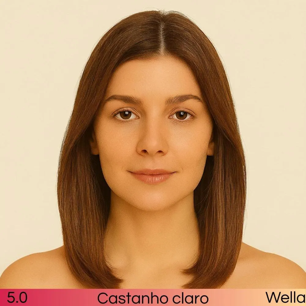 Cabelos com tom castanho claro sofisticado, reflexos uniformes, brilho radiante e aspecto saudável e natural.