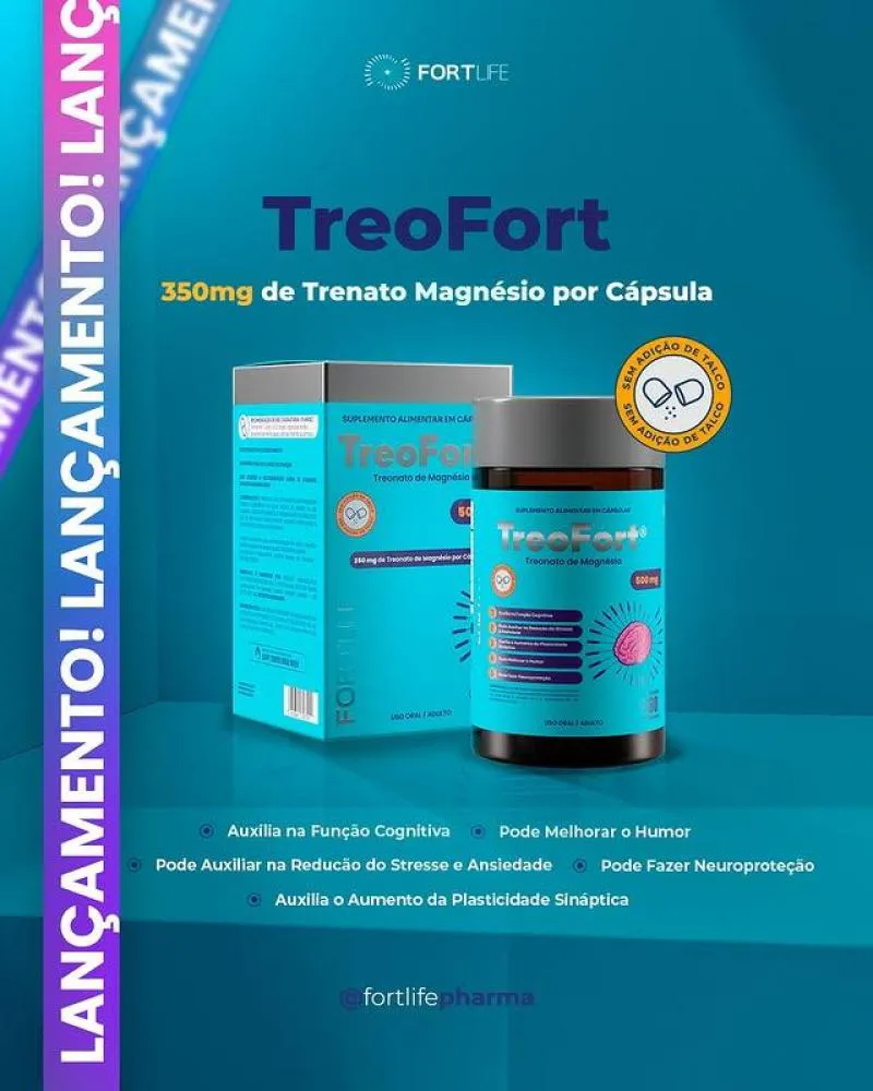 TreoFort da Fortlife, com 350 mg de Treonato de magnésio por cápsula, livre de talco, um excipiente que pode apresentar riscos potenciais para a saúde, incluindo fatores cancerígenos. TreoFort é o suplemento ideal para quem busca o melhor para o seu bem-estar. Escolha TreoFort para sua suplementação.Benefícios