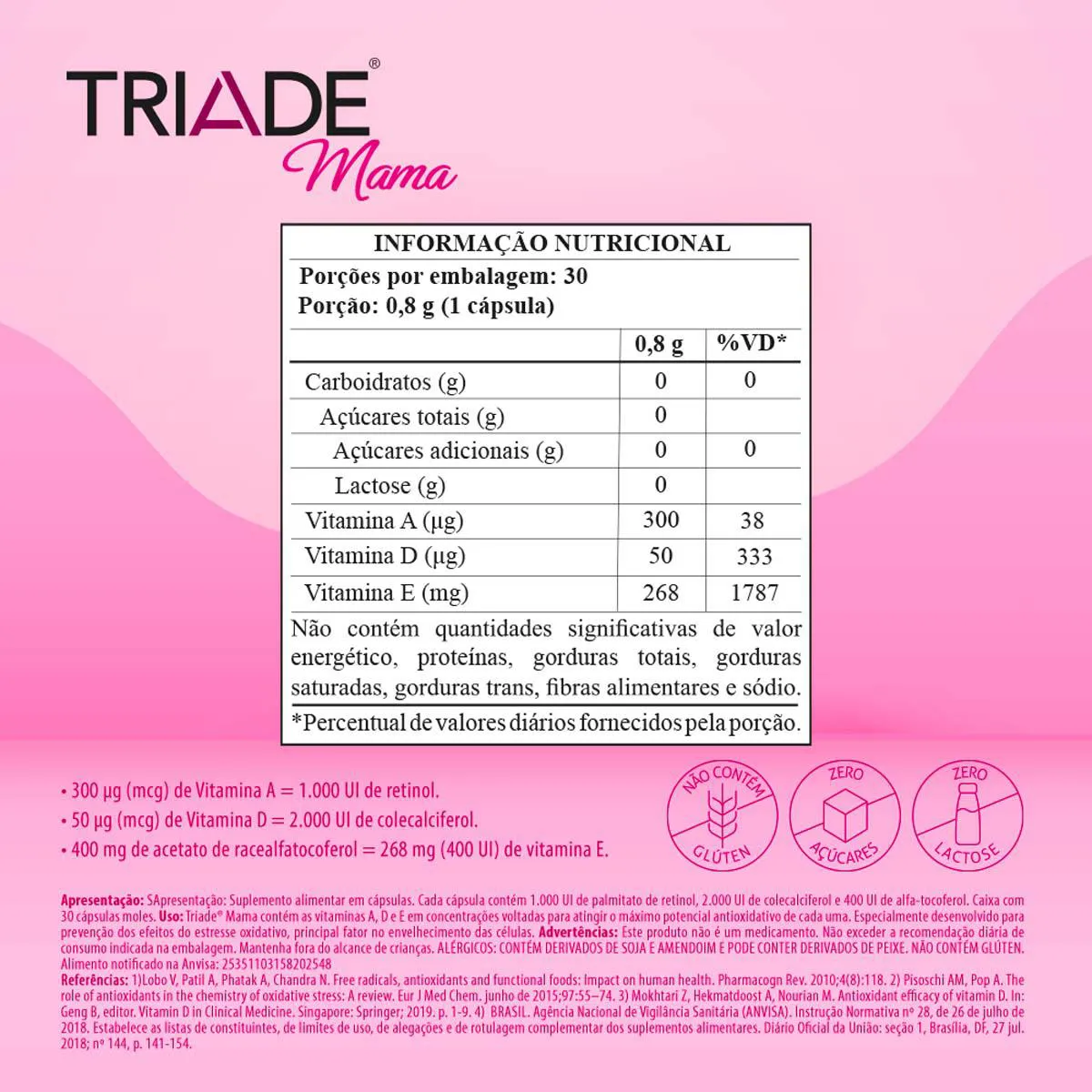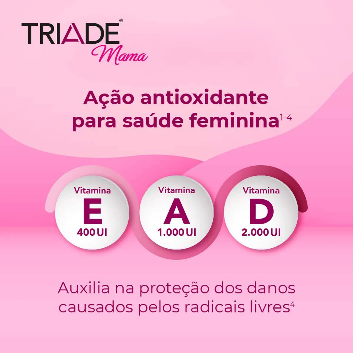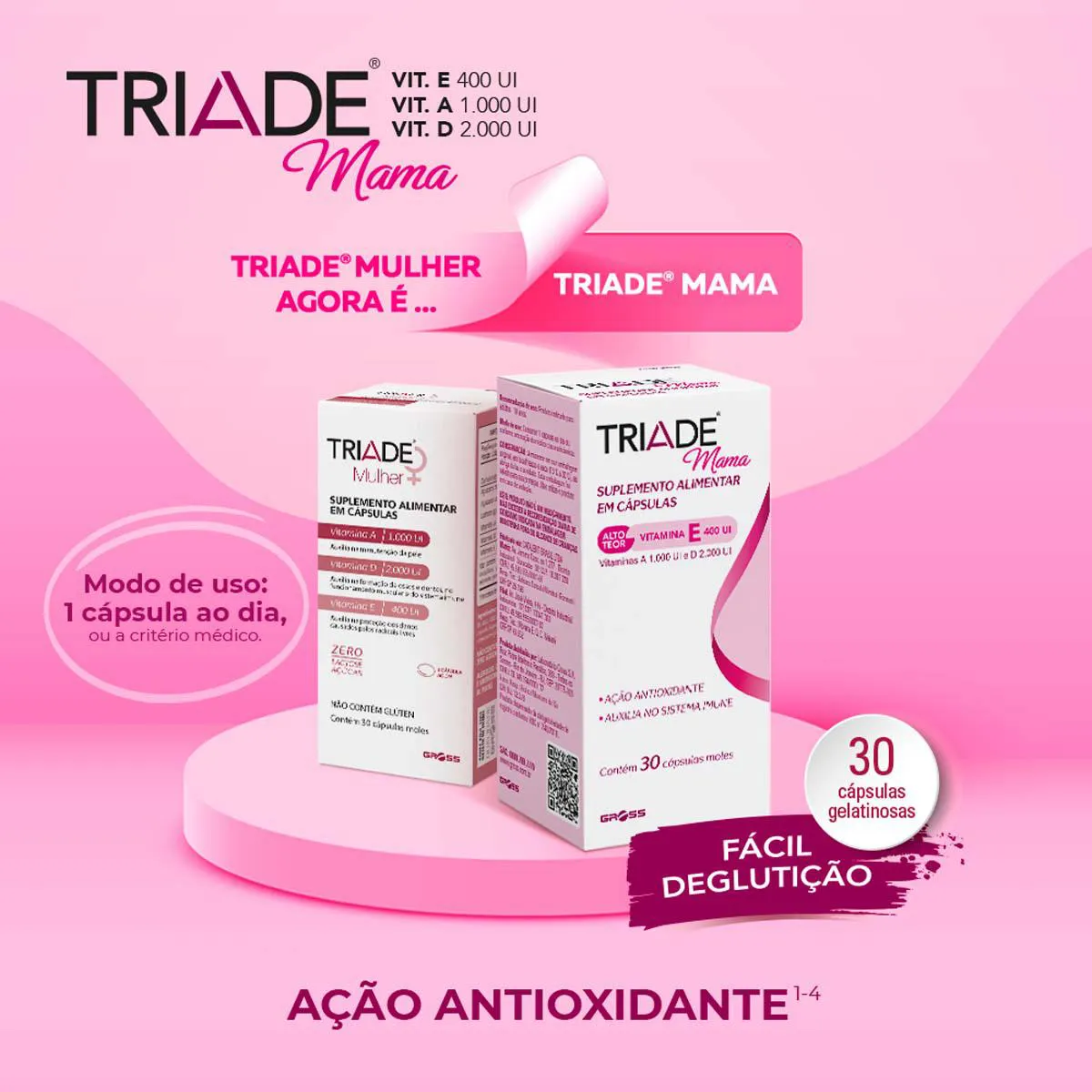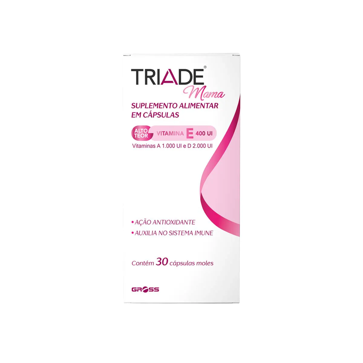 Triade Mama é um suplemento alimentar em cápsulas, a base de vitaminas essenciais para o bom funcionamento do organismo e para a manutenção óssea da mulher. Triade Mulher é formulado com as vitaminas A 1.000 UI, D 2.000 UI e E 400 UI.