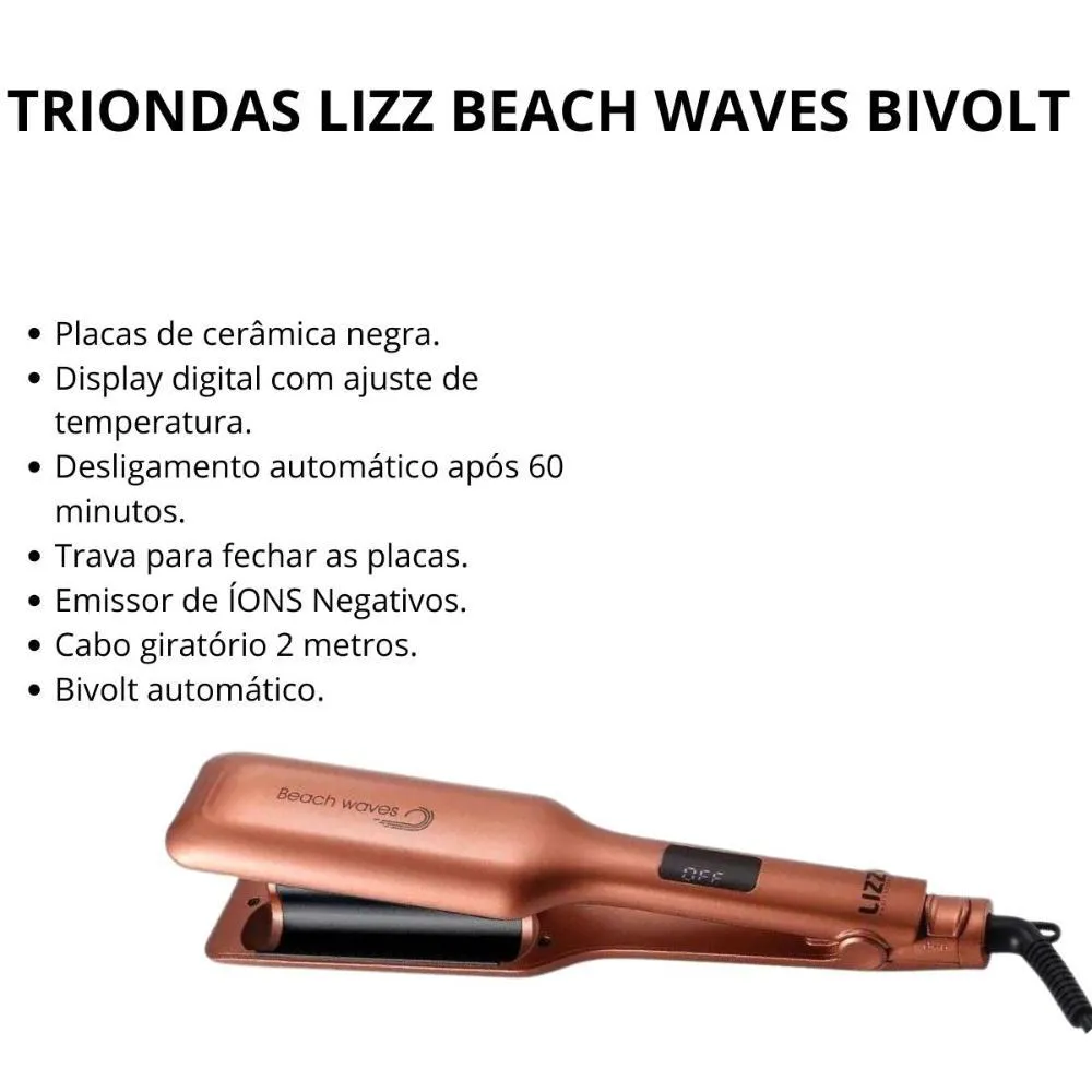Marca: LIZZProduto: Triondas Lizz Beach Waves BivoltEAN: 7898605222667Material: Cerâmica negraTemperatura Máxima: 210°C/410°FControle de Temperatura: Display digital com ajuste de diferentes estágiosEmissão de Íons: Emissor de ÍONS NegativosDesligamento Automático: Após 60 minutosCabo: Giratório de 2 metrosTensão: 127V - 220V (Bivolt automático)Potência: 78WFrequência: 60HzCondições de Operação: Ideal para todos os tipos de cabeloModelo: LGY1000