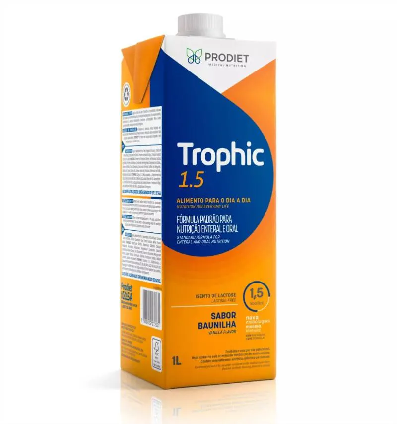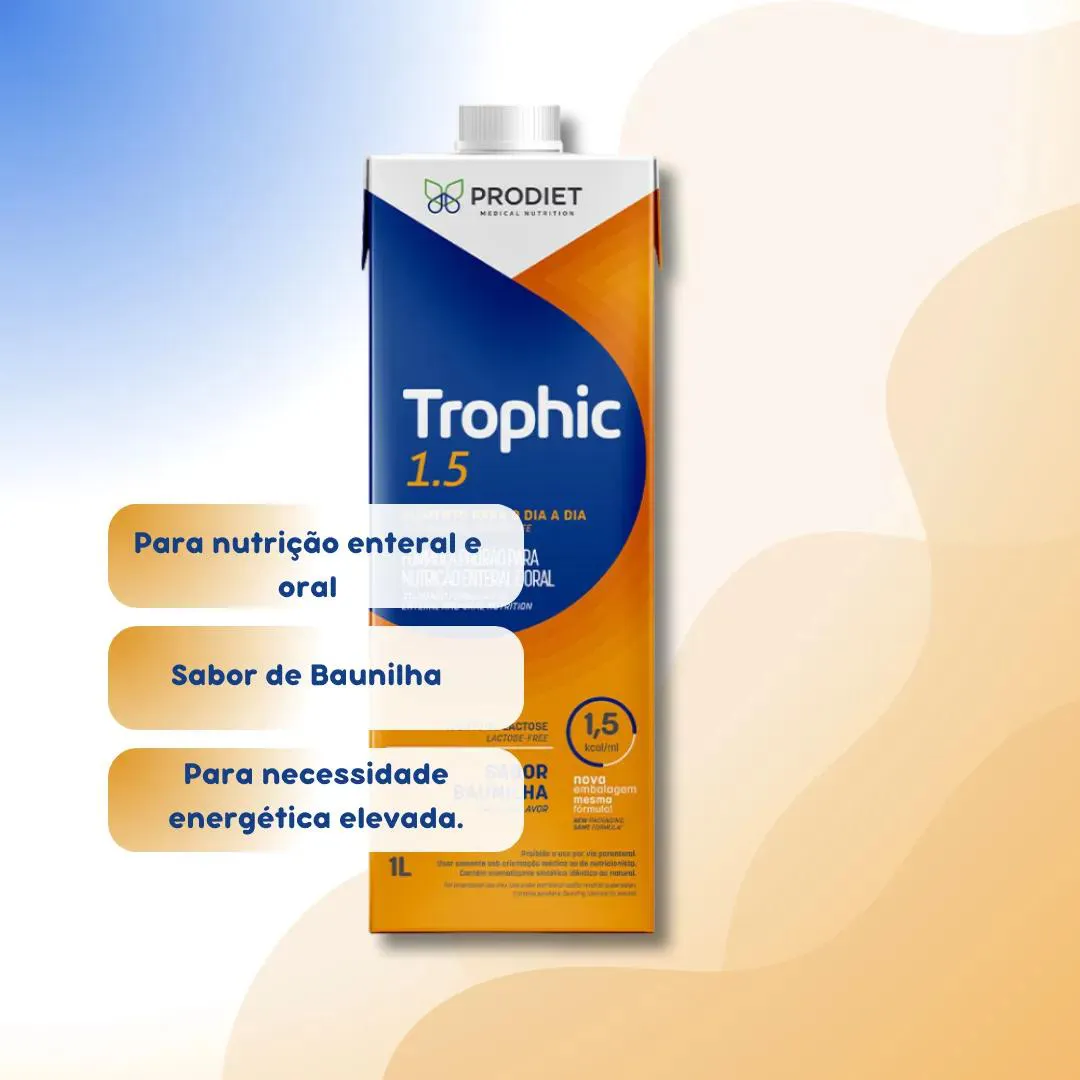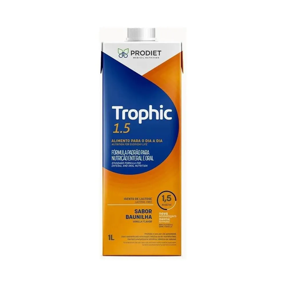 Dieta nutricional líquida hipercalórica sabor baunilha para suporte nutricional completo. Trophic 1.5 Sabor Baunilha - 1 litro O Trophic 1.5 Baunilha é uma dieta nutricional líquida hipercalórica desenvolvida para auxiliar no suporte nutricional de pessoas com necessidades energéticas aumentadas ou ingestão alimentar reduzida. Fornece proteínas, carboidratos, gorduras, vitaminas e minerais que contribuem para a manutenção do estado nutricional e fornecimento de energia. É indicado para uso oral ou por via enteral, conforme orientação de profissional de saúde, sendo utilizado em situações de suporte nutricional clínico ou domiciliar. Advertências Este produto não é medicamento. Deve ser utilizado sob orientação de profissional de saúde. Contém derivados de leite. Conservar em local fresco e seco. Após aberto, manter refrigerado e consumir em até 24 horas.