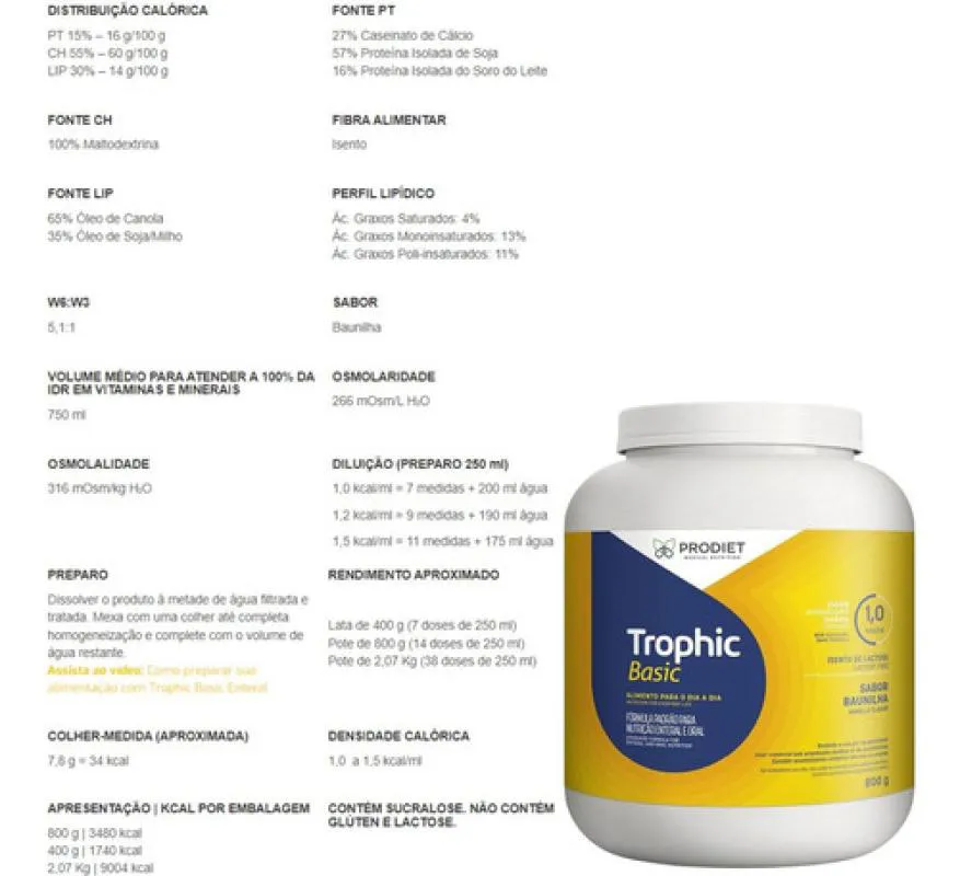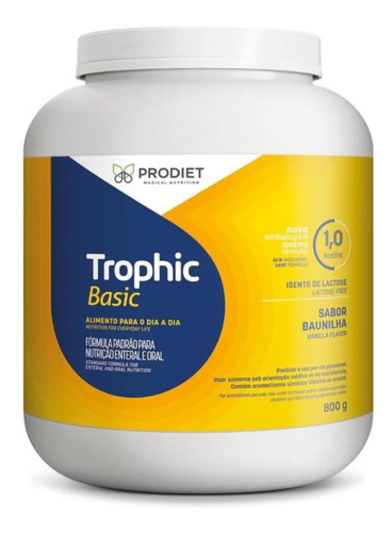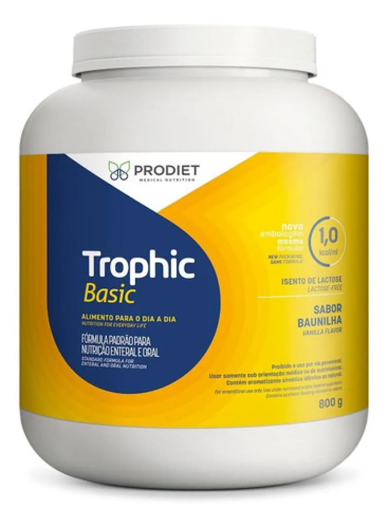 Trophic Basic é uma fórmula nutricionalmente completa, normocalórica (1,2 kcal/ml) e normoproteica, com exclusivo mix de proteínas e baixo teor de gordura saturada.Embalagem: Pote de 800 g.Sabor: Baunilha.