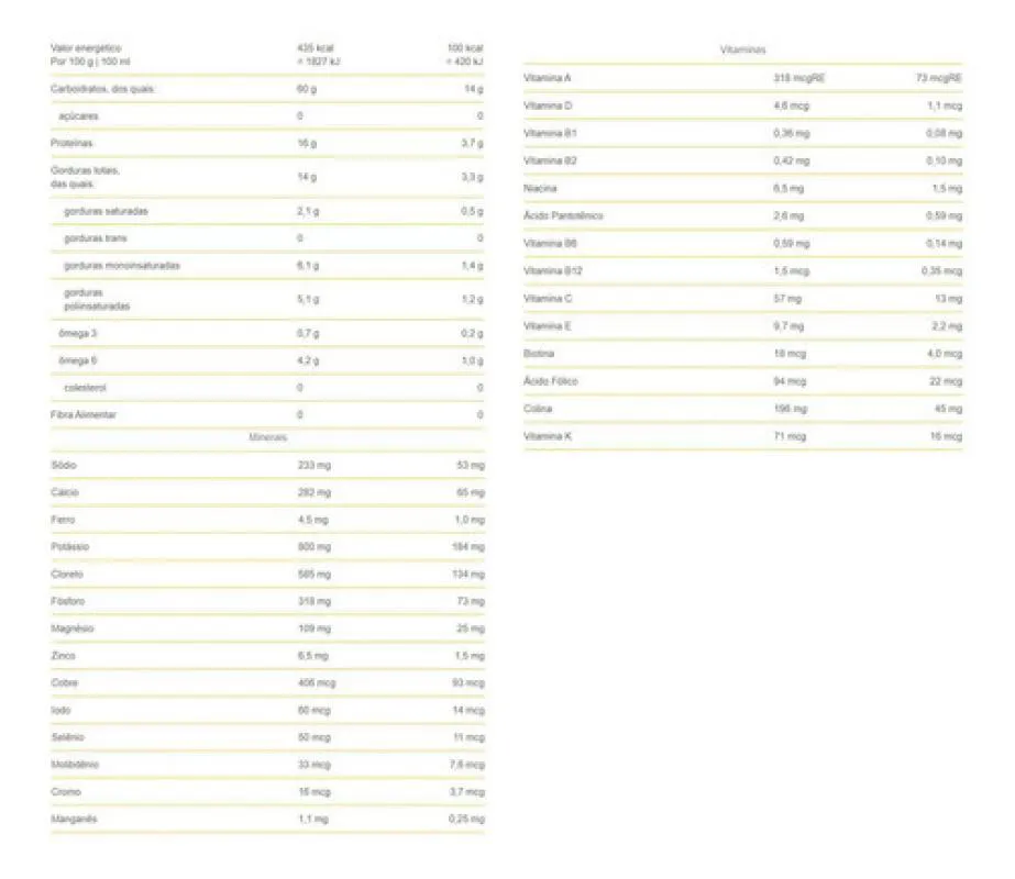 IngredientesMaltodextrina, óleo vegetal (canola e milho/soja), proteína isolada de soja, proteína do leite (caseinato de cálcio e proteína isolada do soro do leite), minerais (cloreto de potássio, fosfato de cálcio monobásico, fosfato de potássio dibásico, carbonato de magnésio, citrato de sódio, citrato de potássio, carbonato de cálcio, gluconato de zinco, gluconato ferroso, sulfato de manganês, sulfato de cobre, selenato de sódio, iodeto de potássio, cloreto de cromo, molibdato de sódio), vitaminas (citrato de colina, L-ascorbato de sódio, acetato de DL-alfa-tocoferila, betacaroteno, nicotinamida, palmitato de retinila, D-pantotenato de cálcio, colecalciferol, fitomenadiona, cloridrato de piridoxina, D-biotina, riboflavina, tiamina mononitrato, ácido N-pteroil-L-glutâmico, cianocobalamina), emulsificantes lecitina de soja e goma xantana, aromatizante, antiumectante dióxido de silício e edulcorante artificial sucralose.