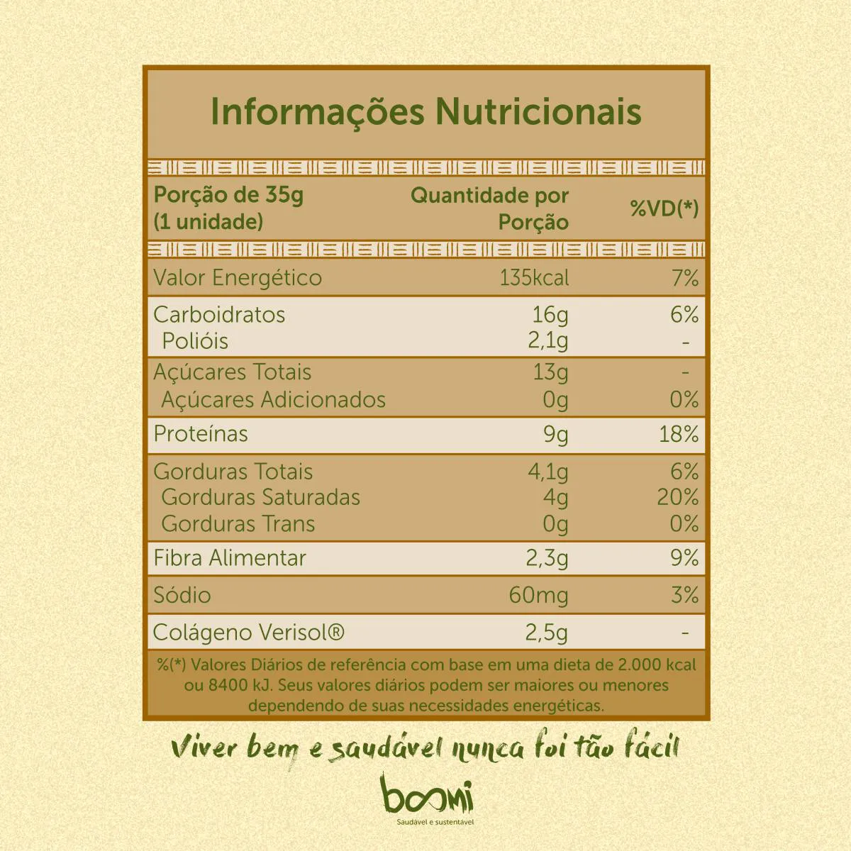 Ingredientes: Pasta integral de tâmaras, colágeno hidrolisado (C-Pure®), coco desidratado, peptídeos bioativos de colágeno hidrolisado de peso molecular médio de 2kDa (VERISOL®), gordura vegetal, clara de ovo pasteurizada em pó, maltitol, leite desnatado em pó, soro de leite em pó, polidextrose, aromatizantes e emulsificantes lecitina de girassol e polirricinoleato de poliglicerol. NÃO CONTÉM GLÚTEN.