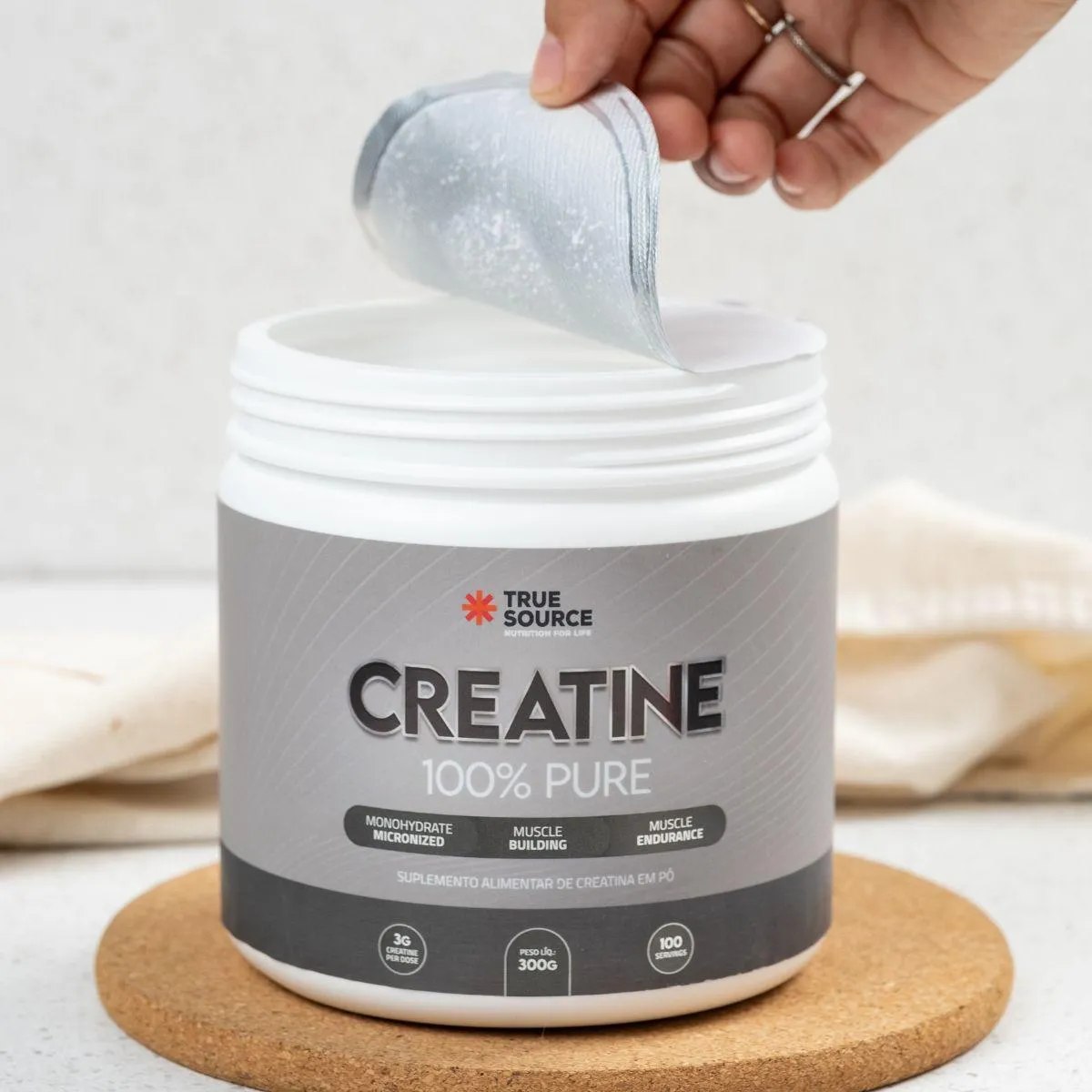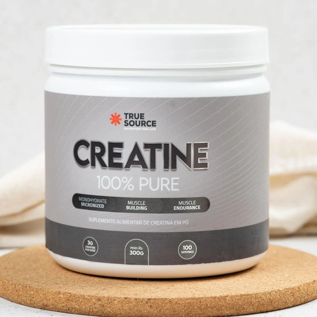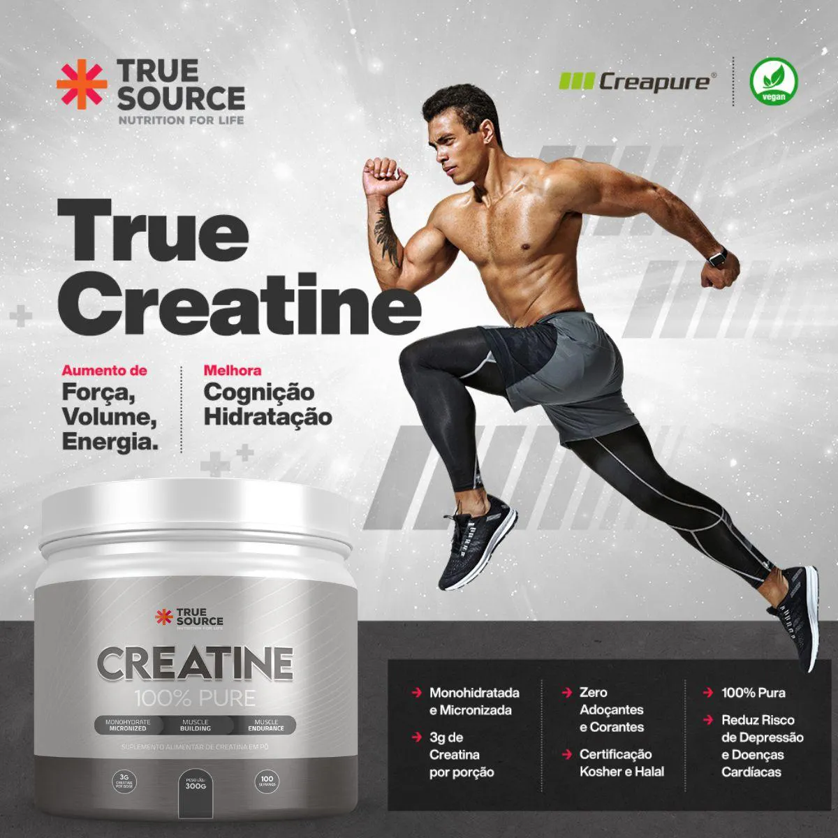 A True Creatine 100% Pure 300g True Source foi desenvolvida para quem busca um suplemento de creatina monohidratada com foco em pureza, solubilidade e facilidade de uso. O produto apresenta creatina em pó com granulometria fina, um formato que favorece mistura, dosagem precisa e uso simples no dia a dia. A proposta da True Source é entregar um suplemento claro, objetivo e alinhado à necessidade de quem prefere fórmulas diretas, sem combinações artificiais ou ingredientes adicionais.