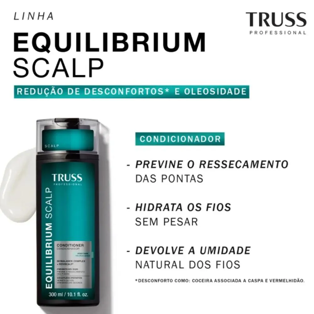 O condicionador Equilibrium Scalp, da Truss, é ideal para cabelos mistos, com raiz oleosa e pontas secas, e para quem sofre com caspa, coceira ou irritação no couro cabeludo. Sua fórmula leve hidrata e desembaraça os fios sem pesar, enquanto age para equilibrar a microbiota capilar. Benefícios e características