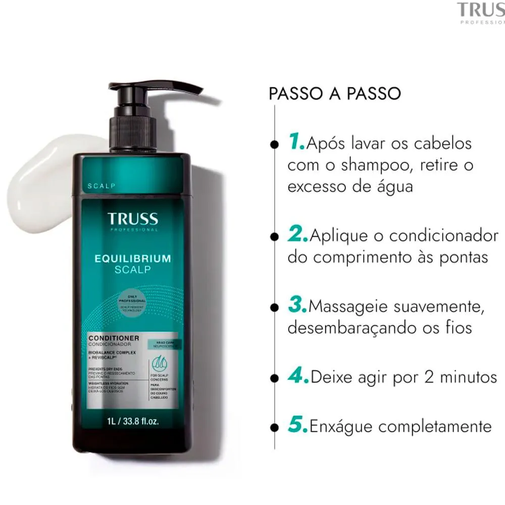 Após lavar os cabelos com o shampoo Truss Equilibrium Scalp RPK, retire o excesso de água. Aplique o Condicionador Equilibrium Scalp RPK 1000ml no comprimento e nas pontas, evitando a raiz para não estimular a oleosidade. Massageie suavemente, desembarace os fios e deixe agir por 2 minutos. Enxágue completamente. Para melhores resultados, use em conjunto com o shampoo e a máscara da linha Equilibrium Scalp.