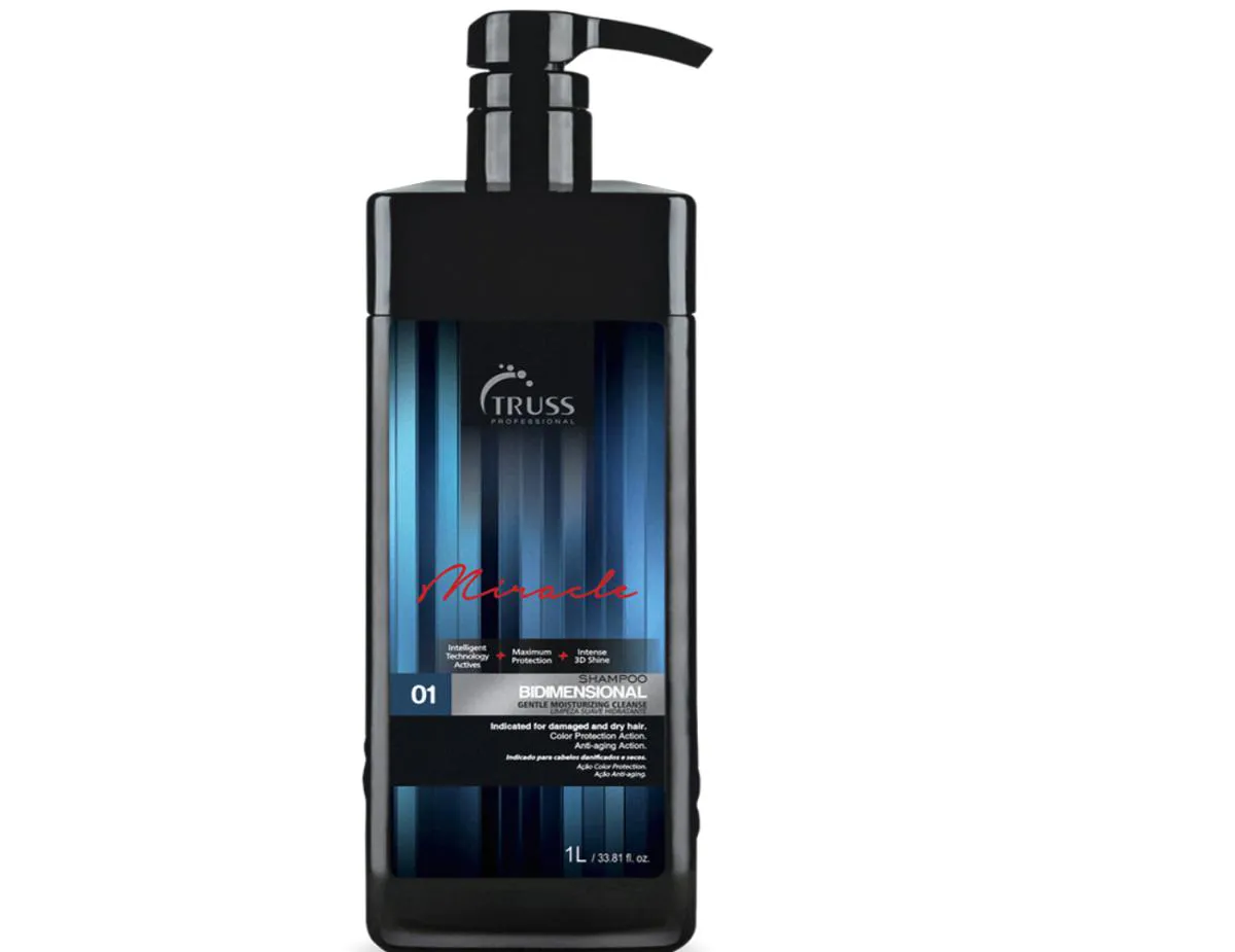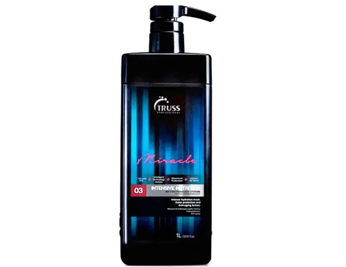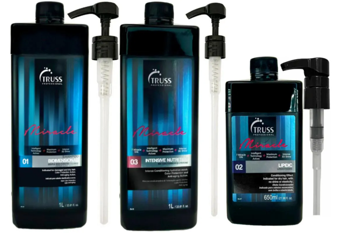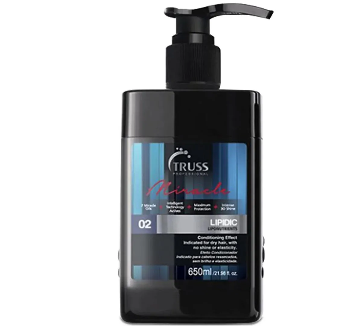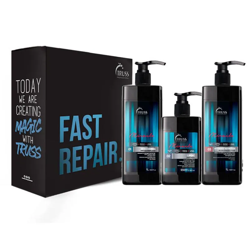 Truss Miracle Kit Fast Repair é um tratamento indicado para recuperar, de forma rápida, os fios frágeis e sem vida que passaram por processos químicos, agressões externas e outros.com ativos de última geração com Nanoproteínas, Aminoácidos e Biolipídeos, que promovem reposição da massa proteica da fibra, recuperando a estrutura capilar, devolvendo resistência e força aos fios de cabelos. SHAMPOO BIDIMENSIONAL: Shampoo para cabelos danificados e secos. Promove limpeza suave, aumenta a elasticidade e resistência dos fios. proporciona hidratação duradoura em cabelos danificados e secos. Devolve a flexibilidade e elasticidade, para que os fios voltem a ser resistentes. Por agir diretamente no couro cabeludo, possibilita um crescimento saudável, aumentando a sustentação dos fios e a saúde do bulbo capilar, além de ter ação anti-aging. DICAS DE UTILIZAÇÃO: Aplique o shampoo nos cabelos úmidos, massageie suavemente, deixe agir por 2 minutos e enxague. RESULTADOS: Cabelos limpos, mais resistentes e brilhantes. INTENSIVE NUTRITION: