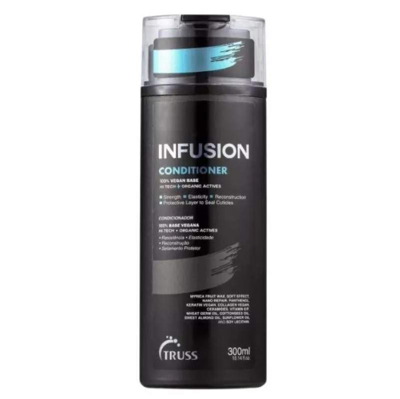 O condicionador Truss Infusion desenvolvido com base 100% Vegana e com pH fisiológico realiza um cuidado especial dos cabelos secos, opacos e quebradiços.Trata o cabelo danificado, auxiliando na reparação e fortalecimento dos fios. Com a ajuda de ativos nano-tecnológicos para agir no interior da fibra capilar e ativos orgânicos para restaurar a resistência e flexibilidade dos fios, recupera a vitalidade e a saúde do cabelo com o cuidado diário. Através da selagem das cutículas intensifica o brilho, reduz as pontas duplas e o frizz, e ainda melhora o desembaraço com fios disciplinados. O Condicionador Vegano Truss Infusion também retém a hidratação do cabelo e promove restauração profunda dos fios, garantindo resistência e maciez, e proteção com ação anti-aging, benéfico também para a proteção da cor de cabelos coloridos. Ação dos ativos:Myrica Fruit Wax: cera 100% vegana que evita a perda de umidade e a evaporação de nutrientes. Assim, aumenta a hidratação interna.Nano Repair: preenche as áreas danificadas no interior da fibra enquanto forma um adesivo sobre as cutículas para conservá-las sempre fechadas.Soft Hair: agente condicionante que proporciona força aos fios, desembaraça, combate o frizz, dá maciez e brilho. Melhora a penteabilidade e minimiza os danos à cutícula.Panthenol: tonifica o couro cabeludo, além de criar uma camada elástica na fibra capilar que hidrata e restaura os fios.colágeno: devolve elasticidade e flexibilidade aos fios.Óleo de Gérmen do Trigo: rico em proteínas e aminoácidos, glicídeos, lipídeos, fosfolipídeos, vitaminas (E e complexo B) e sais minerais, regenera o fio.Óleo de Semente de algodão: Possui fator de proteção solar natural, confere hidratação aos fios.Óleo de Girassol: evita o ressecamento dos fios e as pontas duplas. Hidrata e proporciona brilho.Lecitina de Soja: derivado da soja, proporciona emoliência aos fios.Óleo de Amêndoas: emoliente, recupera fios danificados e pontas ressecadas. Reduz o volume nutrindo e proporcionando brilho. Auxilia o combate a caspa e descamação do couro cabeludo.vitamina e: ação antioxidante, combate os radicais livres e evita o envelhecimento prematuro dos fios. Protege dos danos causados pelos raios solares. Auxilia no crescimento dos fios e combate problemas de queda.vitamina F: desacelera a perda de pigmentação dos cabelos. Revitaliza cabelos secos e danificados.Ceramidas: recupera a coesão das cutículas do cabelo, protegem a coloração e confere brilho.Queratina: recupera a resistência dos fios enquanto deixa o cabelo mais encorpado. Indicação: Cabelos secos, opacos e quebradiços. Ativos Especiais: Myrica Fruit Wax, Nano repair, Soft Hair, Panthenol, Colágeno, Óleo de Gérmen do Trigo, Óleo de Semente de Algodão, Óleo de Girassol, Lecitina de Soja, Óleo de Amêndoas, Vitamina E, Vitamina F, Ceramidas e Queratina. Resultado: Cabelo desembaraçado, reconstruído, fortalecido, macio e com brilho.