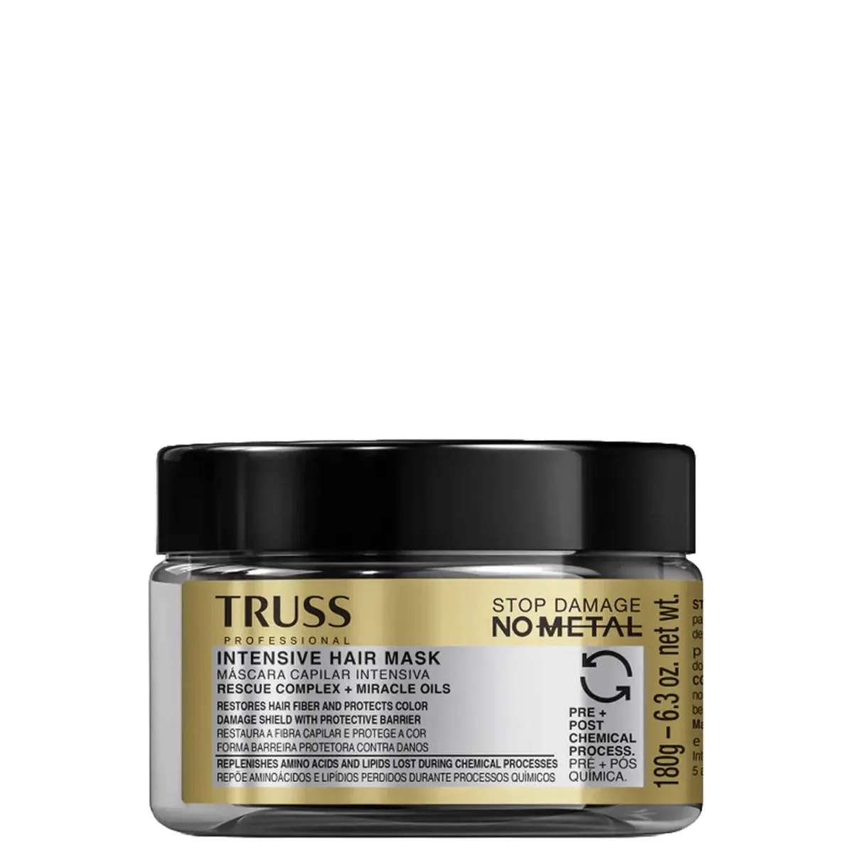 A máscara Capilar TRUSS No Metal é o tratamento intensivo e profundo para cabelos danificados e quimicamente tratados, sendo ideal para quem passou por processos de descoloração ou coloração. Esta máscara foi especialmente desenvolvida para proporcionar uma restauração capilar profunda, reconstruindo as fibras capilares tanto no pré quanto no pós-química. Com Blend de Miracle Oils e o poderoso Rescue Complex, atua recuperando os danos causados aos fios, repondo aminoácidos proteicos e lipídeos essenciais que resultam em: