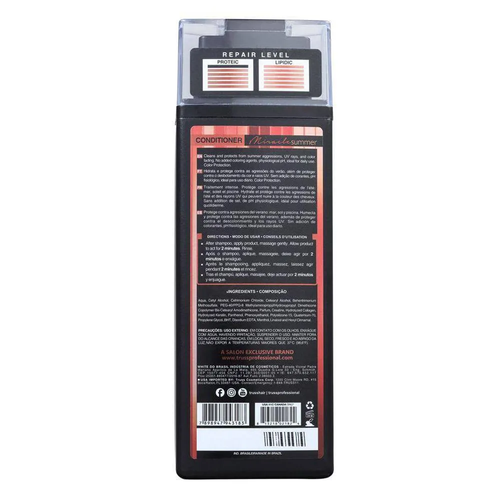 O Truss Miracle Summer é um condicionador desenvolvido para proteger os cabelos contra as agressões do verão, como exposição ao mar, sol e piscina. Ele atua na proteção dos fios, mantendo sua estrutura, hidratação e cor, além de proporcionar maciez, brilho e proteção térmica para todos os tipos de cabelo.