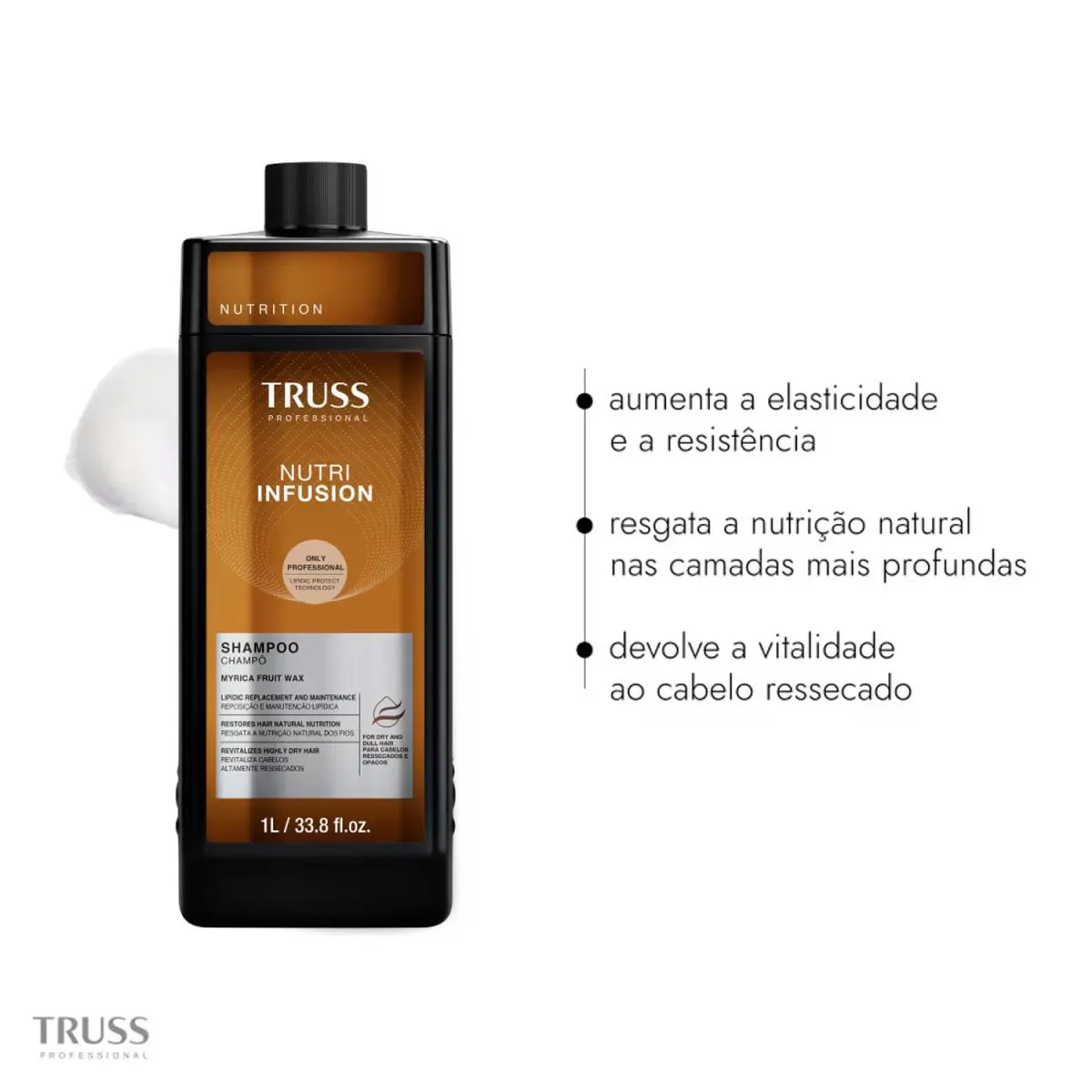 O Shampoo Nutri Infusion TRUSS forma espuma cremosa que remove as impurezas dos fios respeitando a fibra capilar, devolvendo para sua cliente um cabelo mais maleável e cheio de vida.