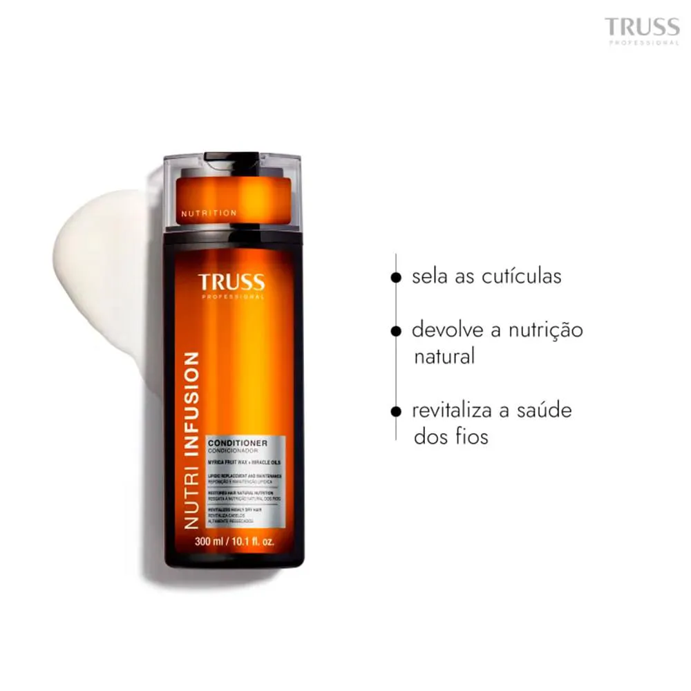Modo de Aplicação: Após lavar com o shampoo Truss Nutri Infusion, aplique o condicionador nos cabelos úmidos, do comprimento às pontas. Massageie suavemente, deixe agir por 2 minutos e enxágue bem, preferencialmente com água fria para selar cutículas.