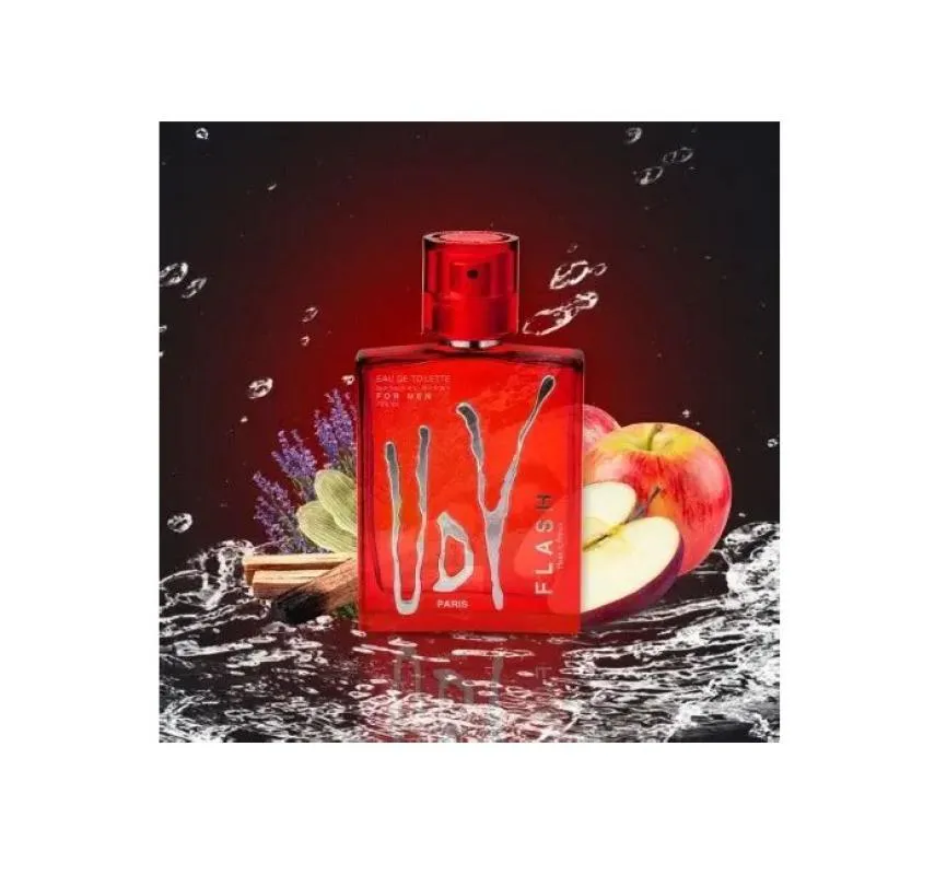 Udv Flash Eau de Toilette Ulric de Varens exibe uma fragrância masculina explosiva. Na nota de saída, o frescor da tangerina, do limão e da maçã explodem em contato com notas marinhas e