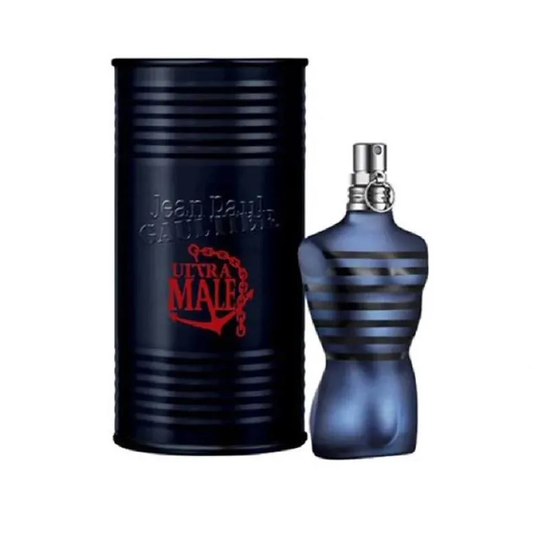 Mais intenso, "Ultra Male" emancipa-se ao aroma original. A profundidade de tons quentes, revelada por meio de combinações maravilhosamente modernas, expressa uma virilidade com um profundo mistério. A embalagem "lata de metal" recebe um efeito matte preto com reflexos azulados hipnóticos, um sinal de intoxicação inebriante que vem dessa fragrância ultra masculina. Sua "essência Le Male" vem escrita em letras vermelhas dentro de uma corrente de âncora pronta para ser suspensa. Com listras pretas, o frasco azul meia-noite emana uma sombra misteriosa que desperta o desejo.