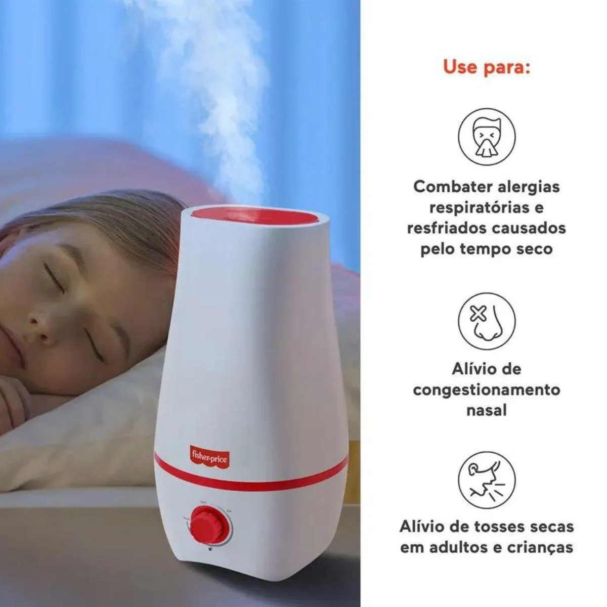 Por dias e noites mais tranquilos! O Umidificador ultrassônico Fisher Price foi desenvolvido para oferecer maior comodidade durante o descanso do seu bebê. Facilitando a respiração das crianças durante o dia e à noite, o umidificador é ideal para locais secos, abafados e que tenham uso constante de ar-condicionado. Alivia a tosse seca, congestão nasal e outros sintomas causados pela baixa umidade do ar.