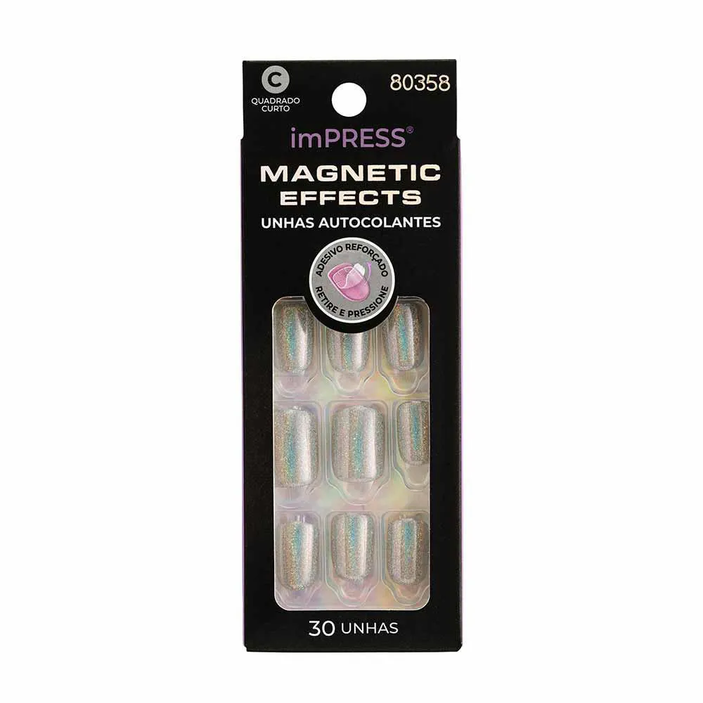 Conheça a nova era das cores. As unhas imPRESS Magnetic Effect são de outro mundo! Seu design premium traz cores exclusivas de efeito magnético, no formato curto e quadrado, seu acabamento permite que o tom mude conforme a luz.
