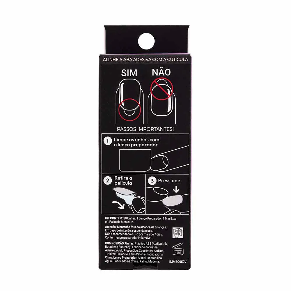 As unhas autocolantes possuem um adesivo sensível a pressão, quanto mais você pressionar, melhor a fixação podendo ter um resultado duradouro. Antes de iniciar a preparação, lixe o leito das unhas naturais para promover maior aderência á unha autocolante. Se desejar, lixe o comprimento e formato das unhas autocolantes após 1h da aplicação. Evite contato com água e demais líquidos antes de 1 h de aplicação.