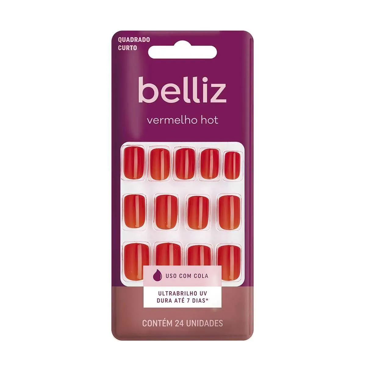 Unhas Belliz Hot Feitas em plástico, são flexíveis, adaptam-se ao formato natural das unhas e são mais resistentes. Função unhas postiças coloridas para aplicação com cola de unhas postiças, não inclusa. Diferencial Possuem cobertura UV, que proporciona brilho e durabilidade para a cor durante todo o uso. Mais variedade de tamanhos para maior precisão no encaixe. Modo de uso 1. Faça o teste do tamanho: Retire as unhas da embalagem e teste-as sobre as suas unhas, selecione e posicione-as em ordem de aplicação. 2. Limpe as suas unhas com álcool ou removedor de esmalte para retirar a oleosidade. 3. Para maior durabilidade, utilize as colas de unhas Belliz, que podem ser encontradas nas versões com bico aplicador (Ref. 1305) ou pincel (1309). 4. Aplique a cola para unhas Belliz sobre a sua unha, e também na parte interna da unha postiça. 5. Comece a aplicação pelo encaixe na cutícula (lado mais fino da unha postiça) e então pressione por alguns segundos até a cola secar.