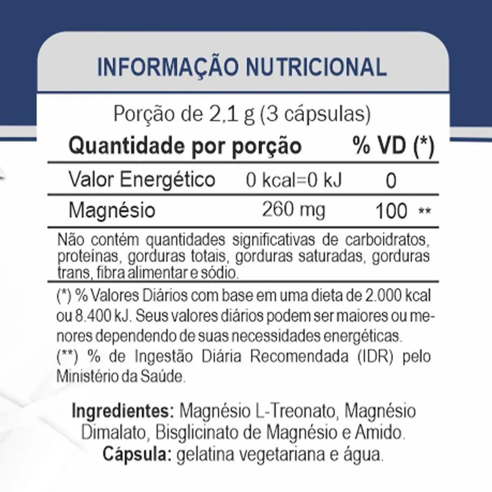 Cada embalagem contém 60 cápsulas, proporcionando uma maneira prática e fácil de consumir magnésio treonato diariamente. As cápsulas são simples de ingerir, facilitando a inclusão regular na sua rotina.
