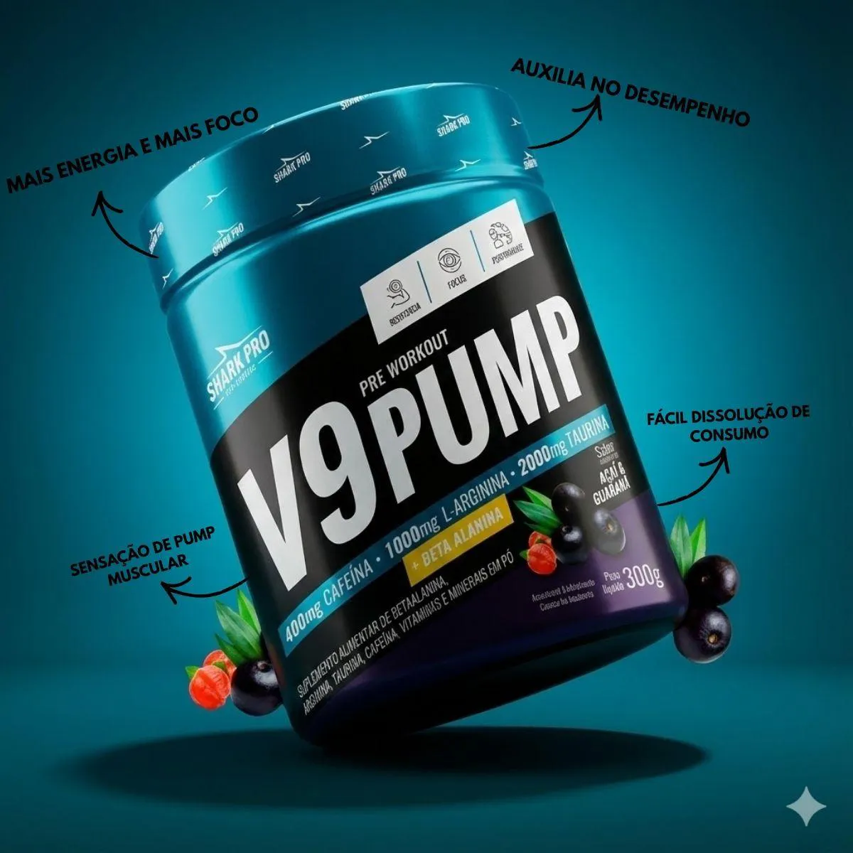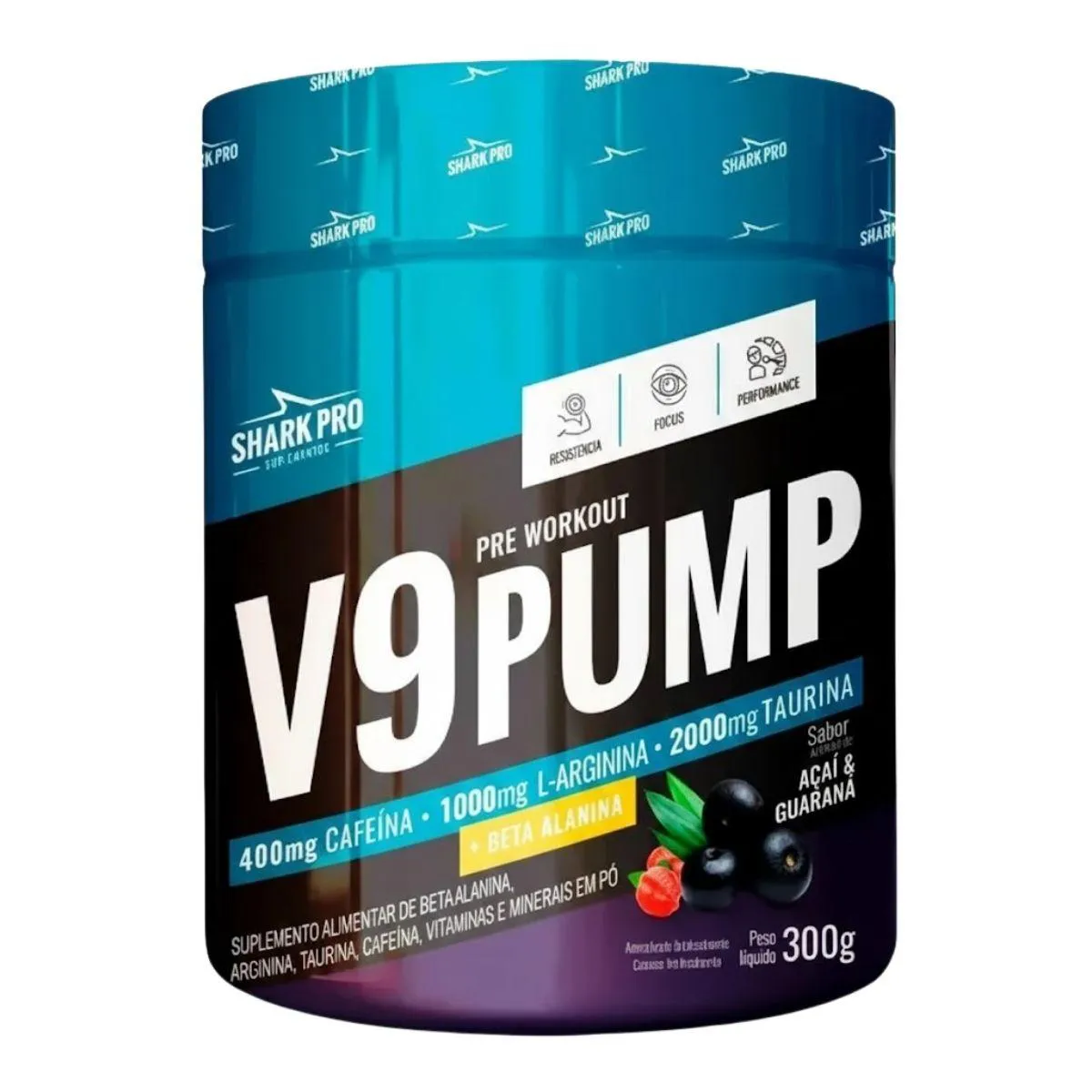 corpo e manter uma rotina ativa com equilíbrio. Entre os principais diferenciais estão a fácil dissolução, o sabor açaí com guaraná encorpado e agradável e a praticidade no consumo diário. Ideal para ser incluído antes do treino, auxilia na preparação do corpo para a atividade física, contribuindo para sessões mais focadas e produtivas. Pode ser utilizado por praticantes de musculação, treinos funcionais, esportes de resistência ou atividades de alta intensidade. A sugestão de consumo é diluir uma porção do produto em aproximadamente 200ml de água gelada, consumindo cerca de 20 a 30 minutos antes do treino, ou conforme a orientação de um profissional de saúde. Produto em pó, embalagem de 300g, indicado para adultos que mantêm uma alimentação equilibrada e hábitos de vida saudáveis. Garanta agora o V9 Pump Pré Treino Açaí com Guaraná Shark Pro e leve seus treinos a outro nível com mais energia, mais foco e mais força. Aproveite enquanto o estoque é limitado.