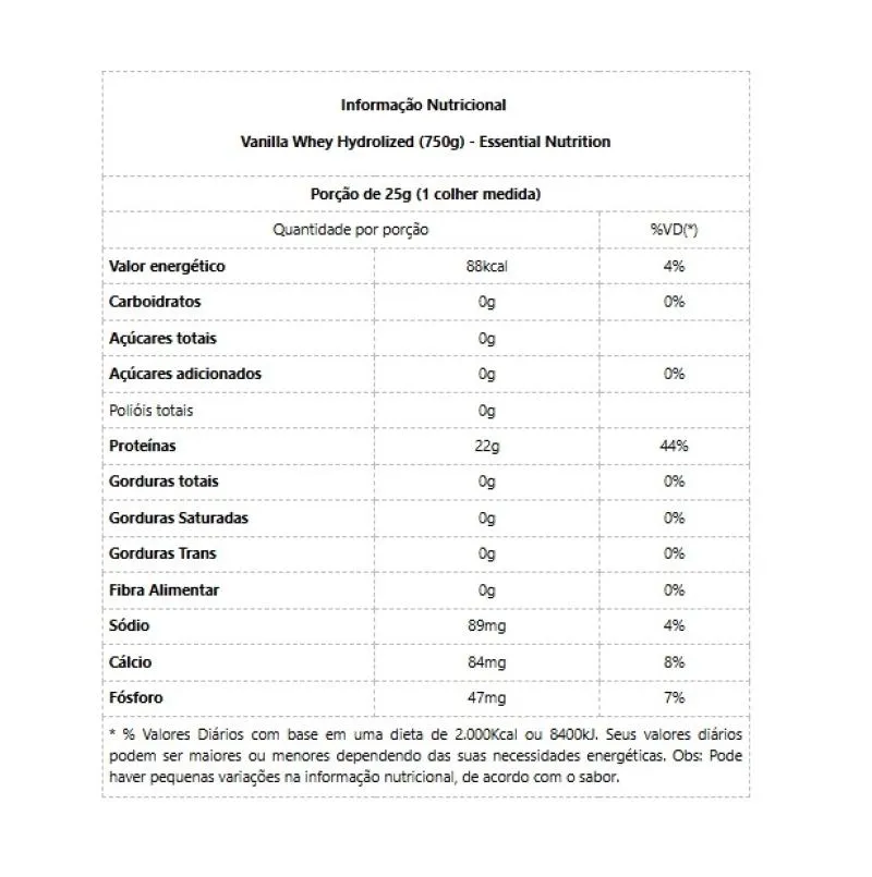 Vanilla Whey Hydrolized (750g)whey protein HIDROLISADO E ISOLADO (THERMAX®690 E PROVON®292) O whey proteinse destaca como o suplemento mais consumido quando o objetivo é manutenção e ganho de massa magra, em função de seu rico perfil de aminoácidos, fator determinante para a construção muscular. O blend de Whey Protein Hidrolisado e Isolado Essential é obtido através do processo patenteado de purificação CROSS-FLOW MICROFILTRATION. Essa tecnologia resulta em uma proteína de melhor qualidade, preservando importantes subfrações proteicas - como lactoferrina, glicomacropeptídeos e imunoglobulinas - e potencializando seu aproveitamento no organismo. colágeno HIDROLISADO EM PEPTÍDEOS - PEPTAN® Peptan® da Rousselaut - marca líder mundial - consiste em um colágeno hidrolisado em estruturas de tamanho extremamente reduzido - chamadas peptídeos - que apresentam excelente solubilidade e absorção potencializada no organismo. O colágeno é o maior constituinte do tecido conectivo e está presente em cartilagens, tendões, pele e ossos. É uma opção de suporte nutricional para atletas, idosos e público em geral.