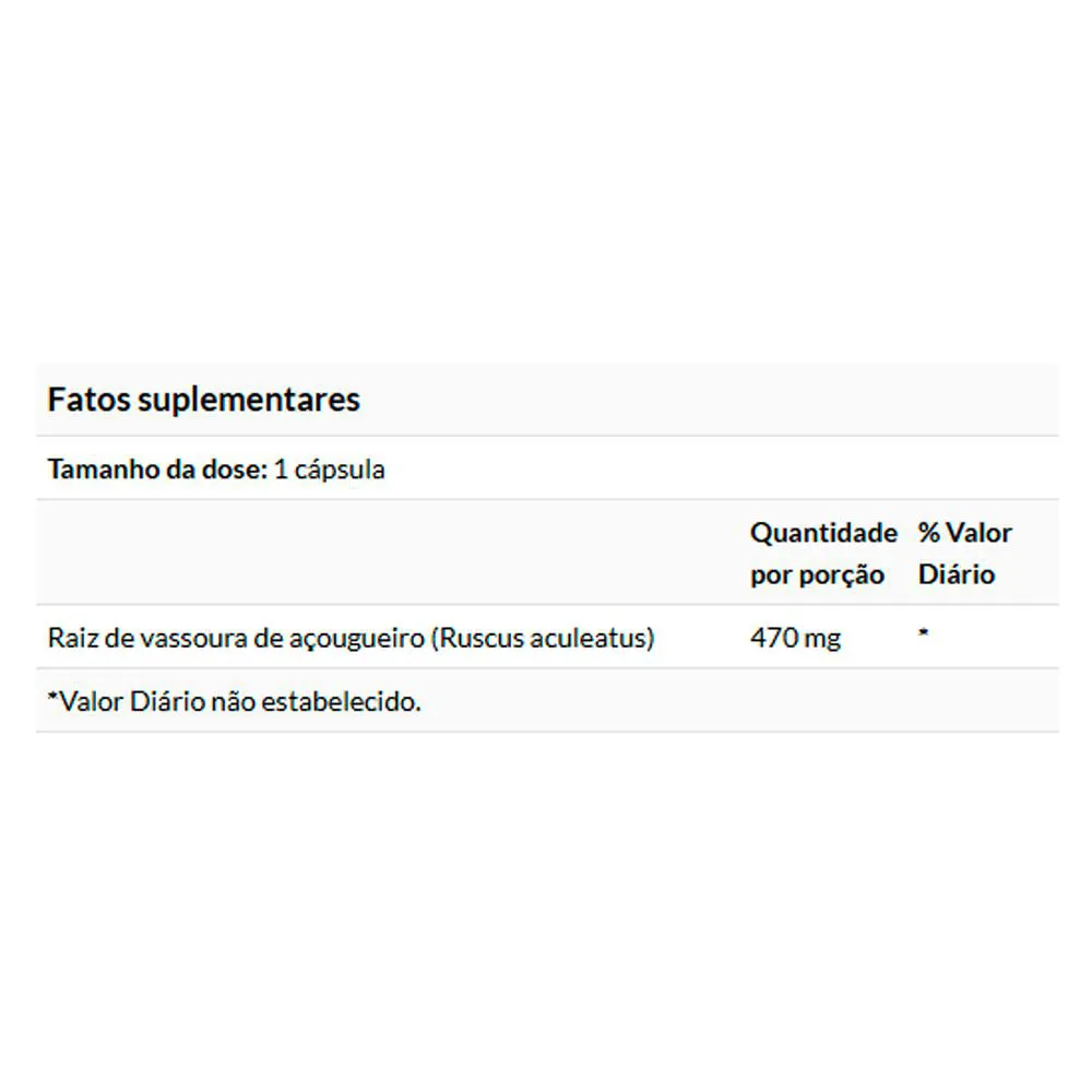 Cada cápsula contém 470 mg de extrato puro de Vassou-ra de Açougueiro, uma planta amplamente valorizada por suas propriedades tradicionais. A fórmula é focada na pureza do ingrediente principal, sem adição de componentes desnecessários, proporcionando uma experiência próxima ao uso natural da planta. Validade longa