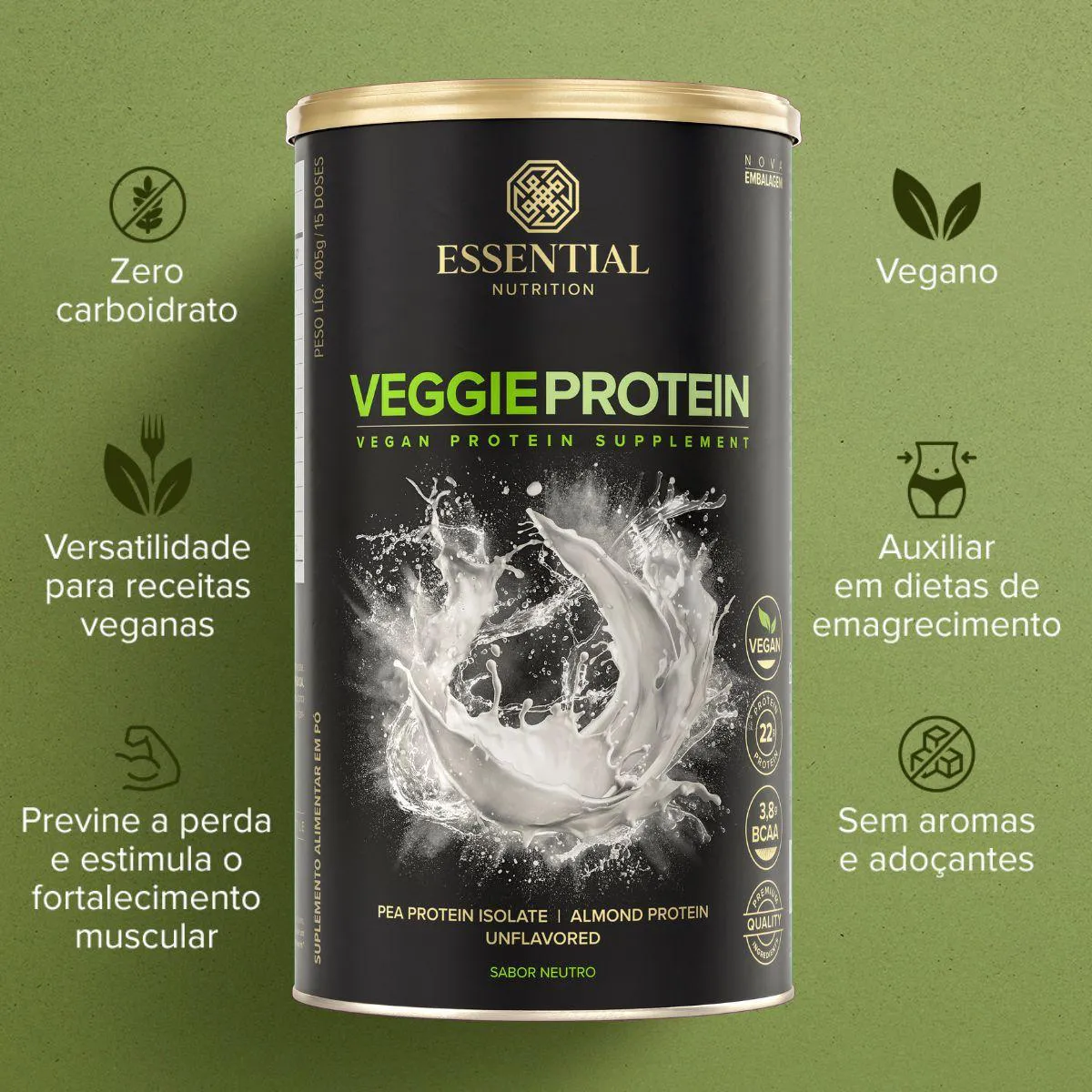 Vegan Protein Veggie da Essential Nutrition é um blend proteico vegetal elaborado com proteínas de ervilha, amêndoa e outras fontes vegetais, oferecendo perfil completo de aminoácidos em uma embalagem prática. O produto foi criado para atender quem segue alimentação baseada em plantas e busca suporte nutricional sem ingredientes de origem animal.