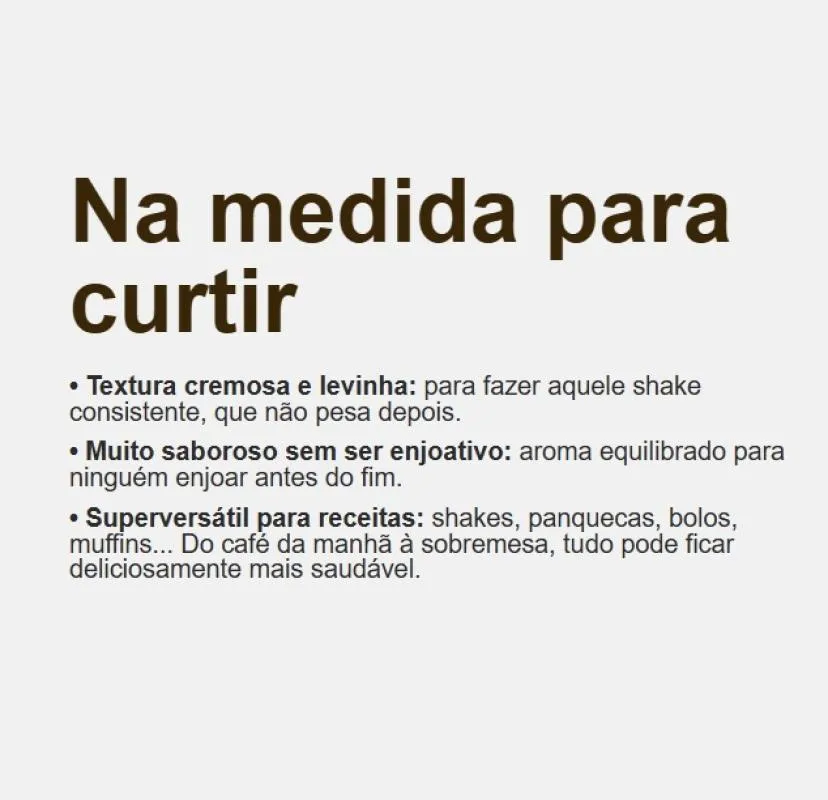 - Textura cremosa e leve, com sabor agradável de brownie de chocolate.