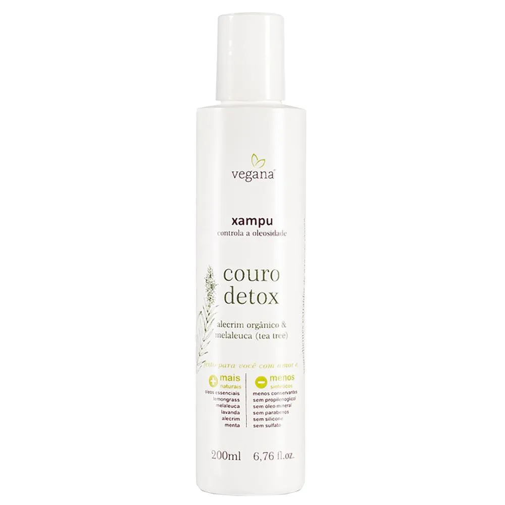 Controle da oleosidade. O Xampu Vegana Couro Detox foi desenvolvido para limpar sem retirar os componentes que mantém a integridade do couro cabeludo. Desenvolvido com óleos essenciais de Alecrim, Melaleuca, Lavanda, Cedro Virgínia, Menta e Lemongrass, compondo uma sinergia que atua na limpeza e recuperação do couro cabeludo.