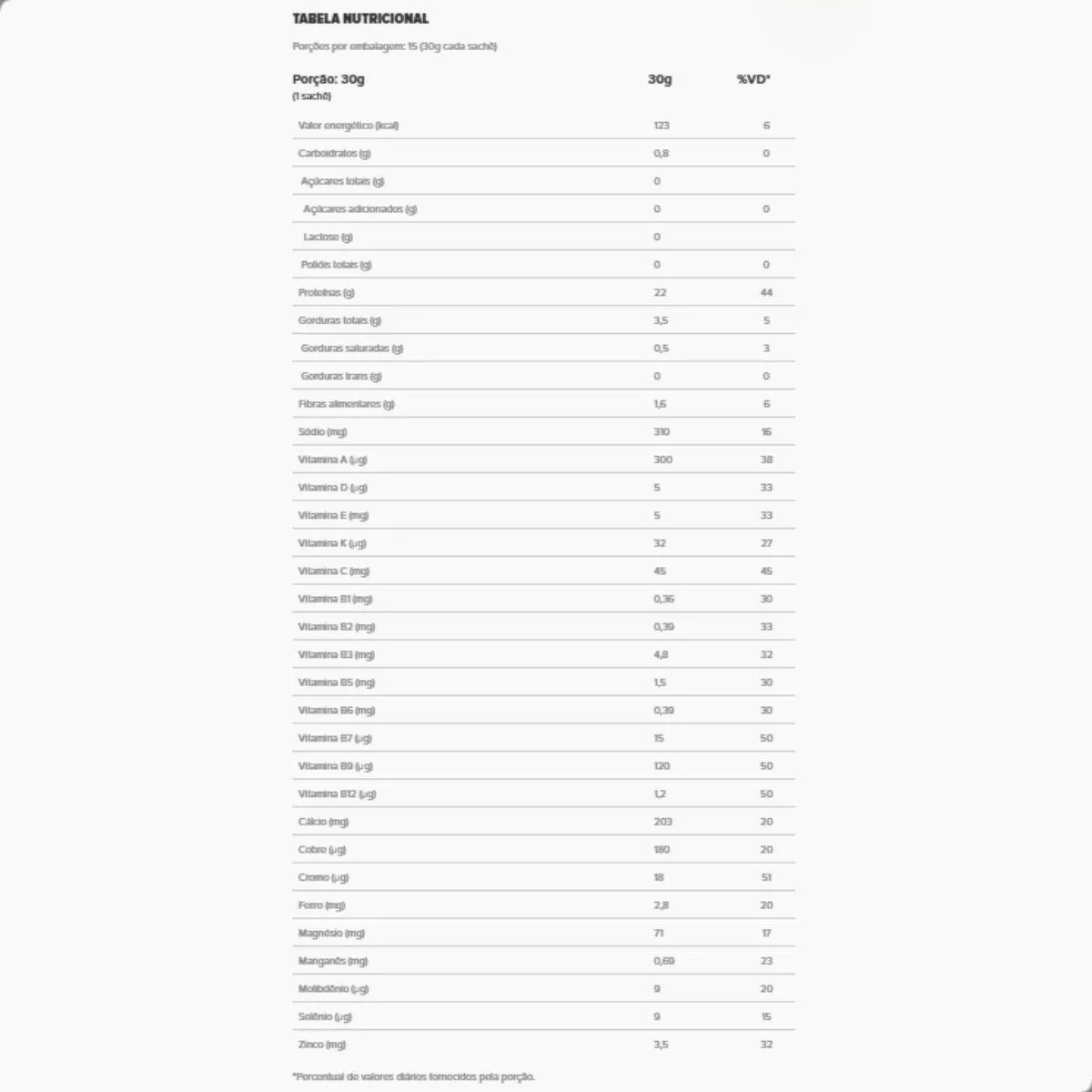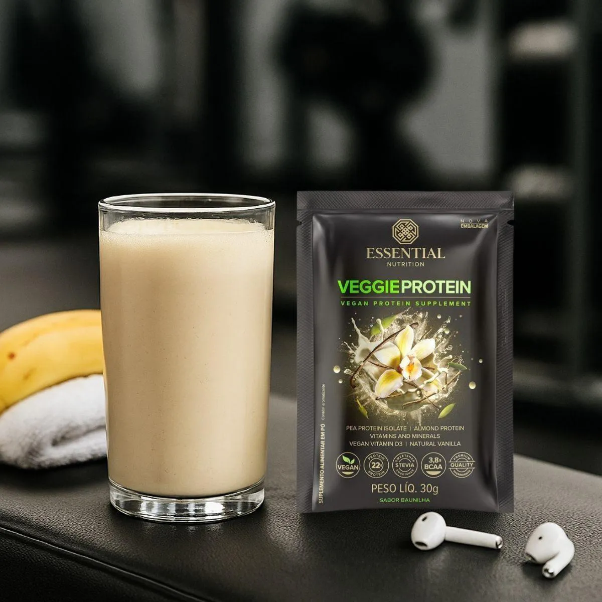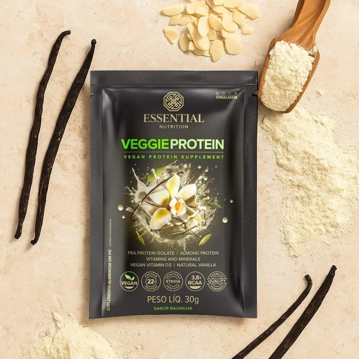- Suplemento proteico vegetal em sachês práticos.