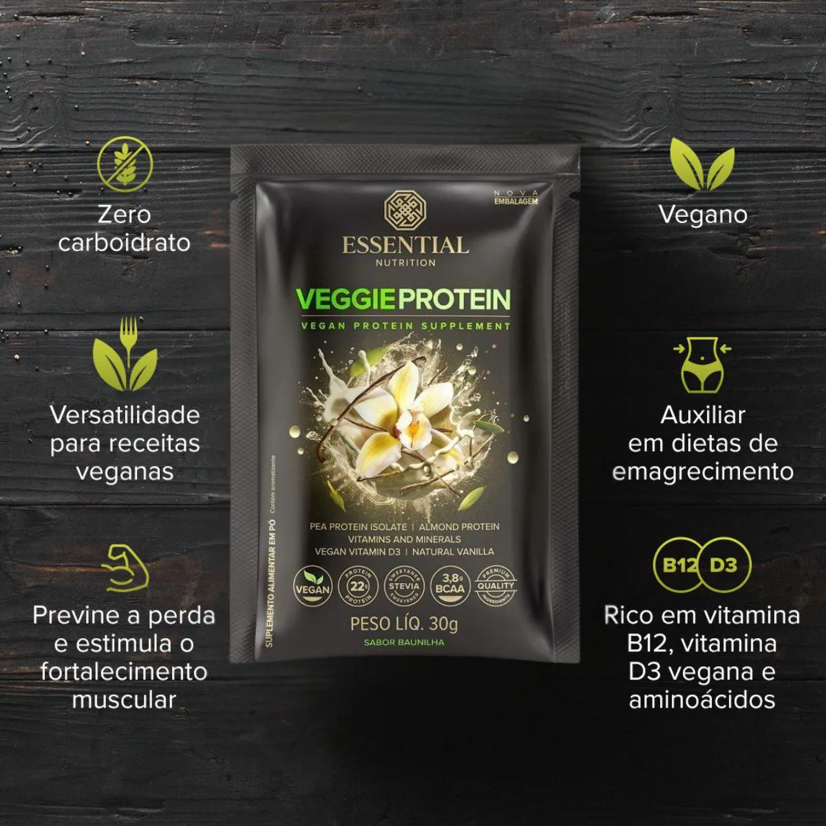 Veggie Protein em sachês da Essential Nutrition é um suplemento em pó totalmente vegetal que oferece uma fonte prática de proteínas e nutrientes. A apresentação em display traz porções individuais, ideal para quem procura conveniência na rotina e deseja variar suas refeições com uma opção vegana.