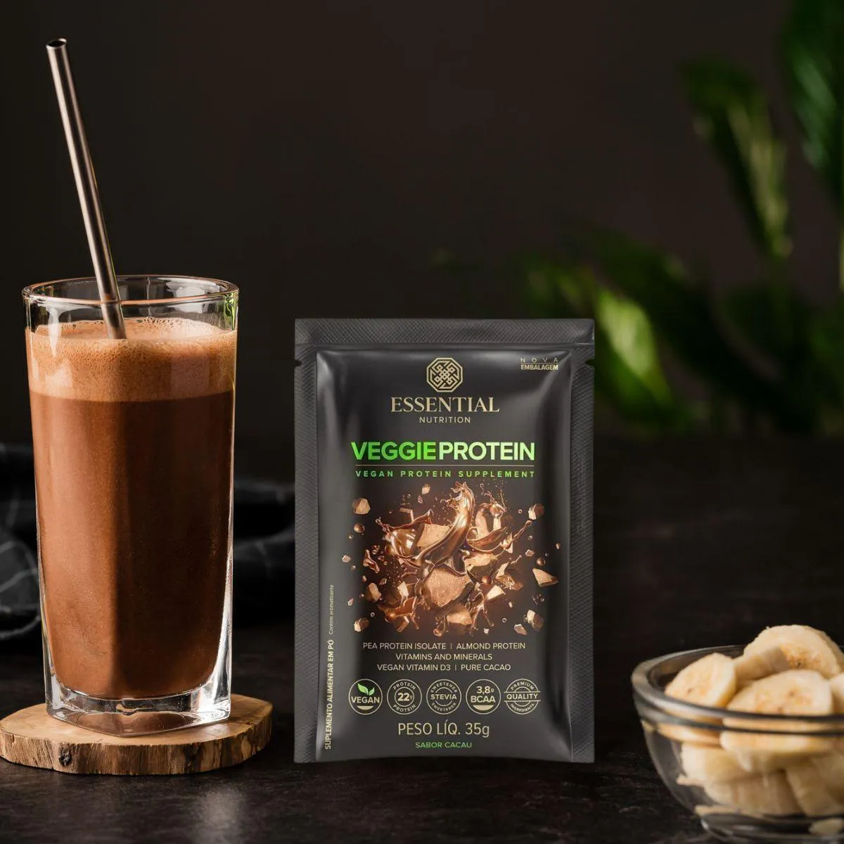 Veggie Protein em sachês da Essential Nutrition é um suplemento em pó totalmente vegetal que oferece uma fonte prática de proteínas e nutrientes. A apresentação em display traz porções individuais, ideal para quem procura conveniência na rotina e deseja variar suas refeições com uma opção vegana.