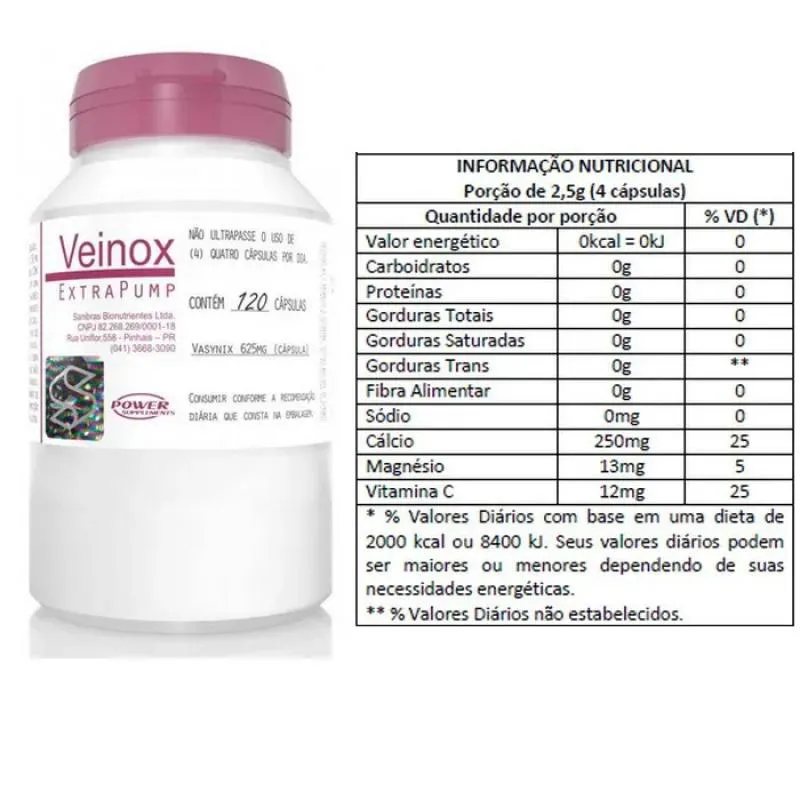 Novo Suplemento desenvolvida pelos mesmos fabricantes do Dilatex. A tecnologia conhecida Vasynix é 2x mais potente que Dilatex. A Veinox oferece resultados de Extra Pump sem precedentes. Mais volume muscular e maior efeito inibidor da fadiga. Veinox é a formulação vasodilatadora mais recentemente desenvolvida no mundo. As cápsulas de Veinox contêm a Tecnologia Vasynix, uma mistura sinérgica de ingredientes projetados para dilatar os vasos sanguíneos, pump extra e inibir a fadiga. É baseado em extratos de plantas combinados com minerais de de qualidade para desenvolver a densidade muscular.Beneficios: