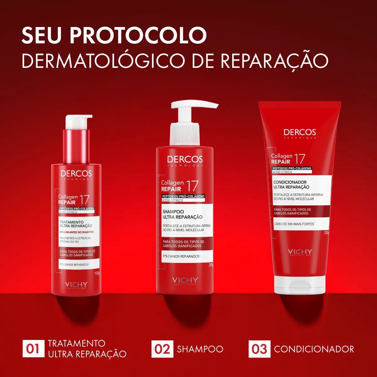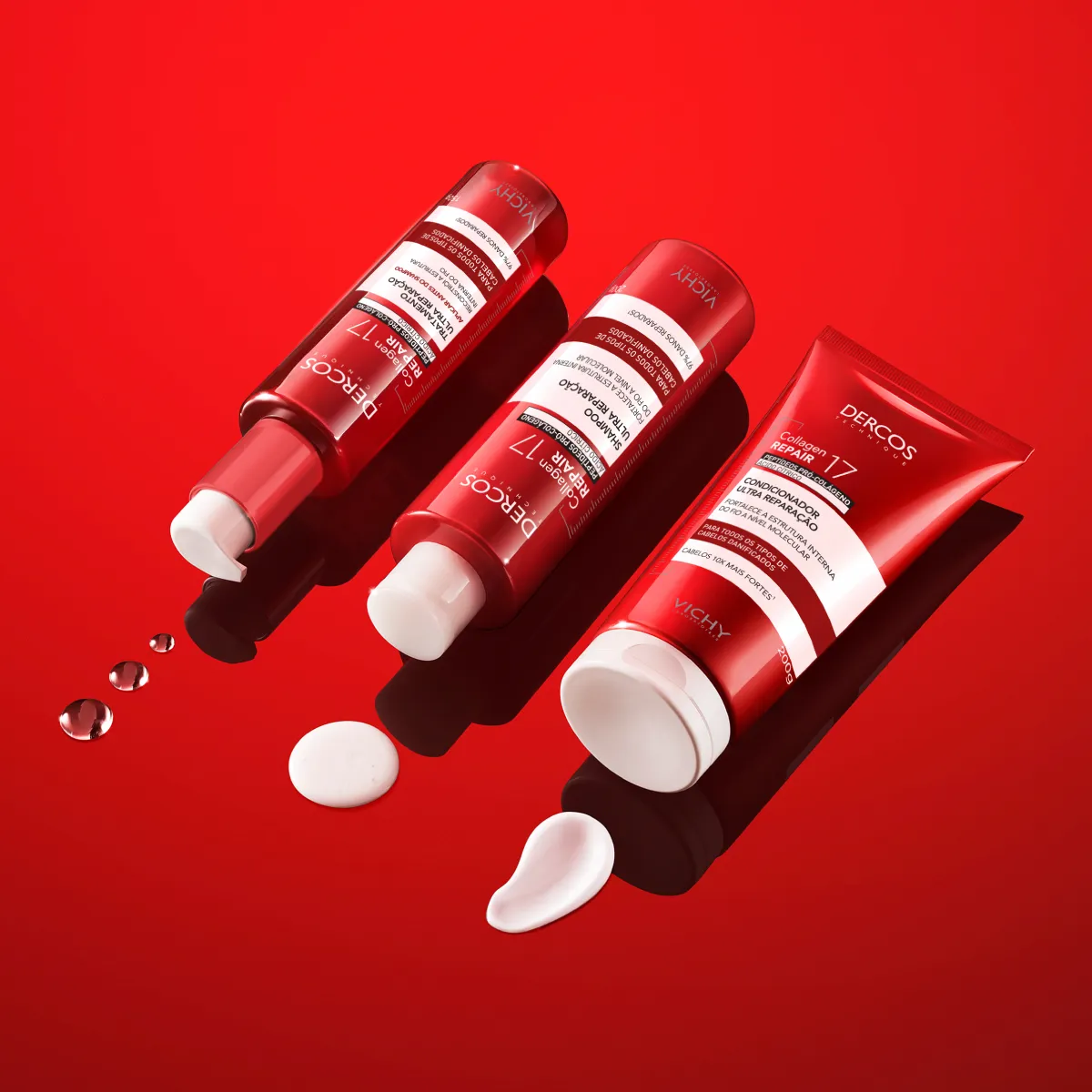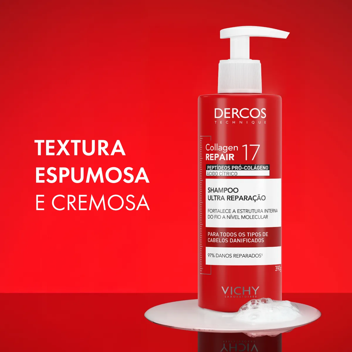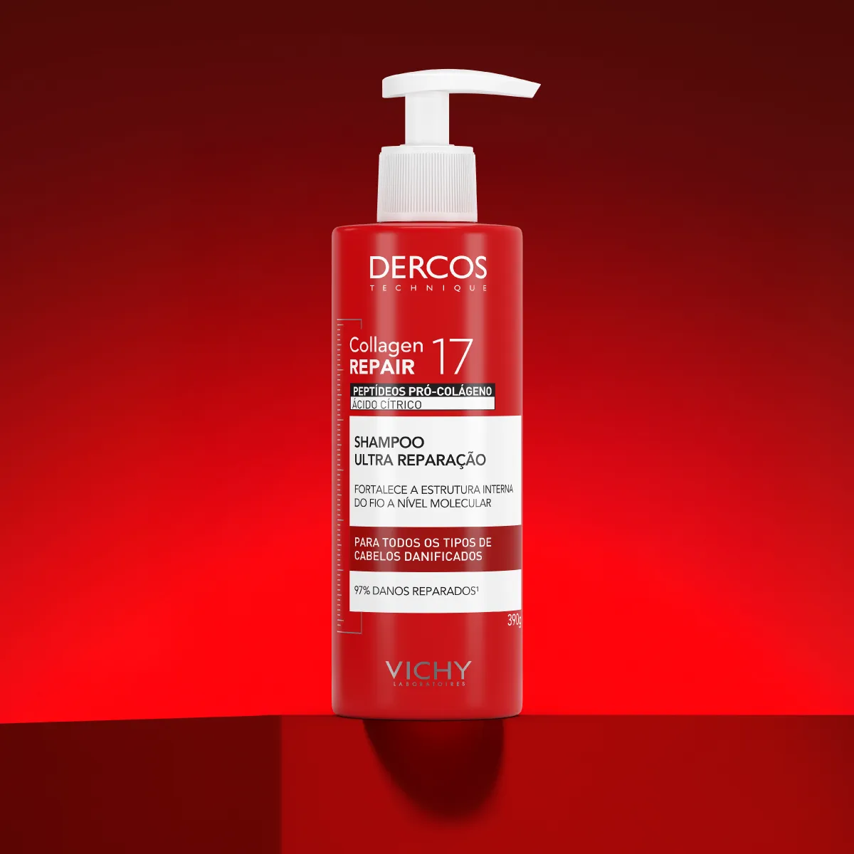 - Shampoo Ultra Reparação Vichy Dercos Collagen 17 fortalece os fios desde a raiz.