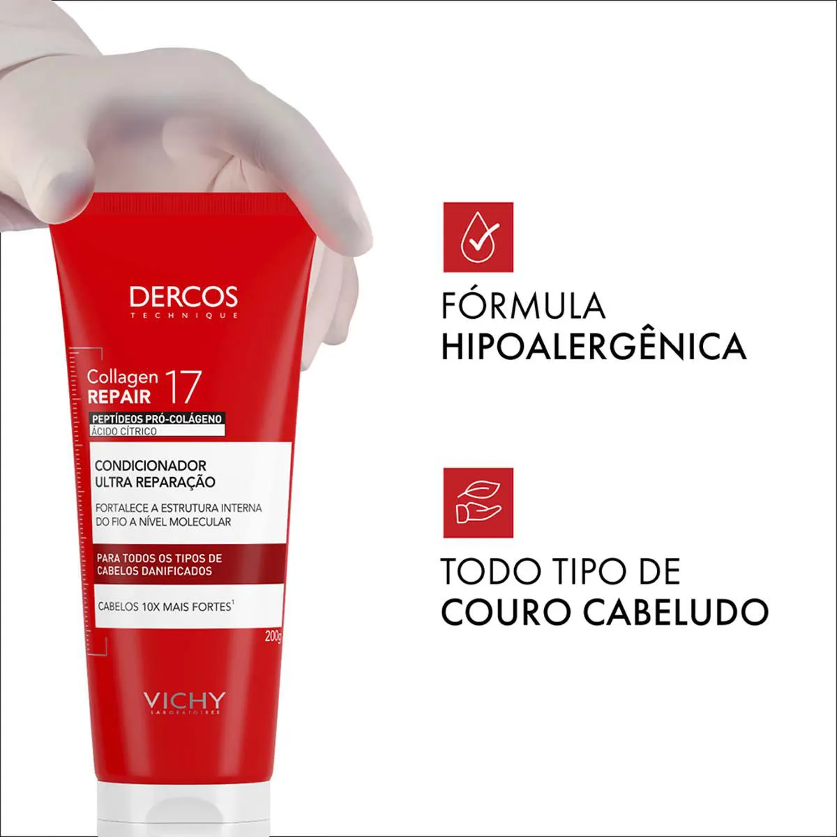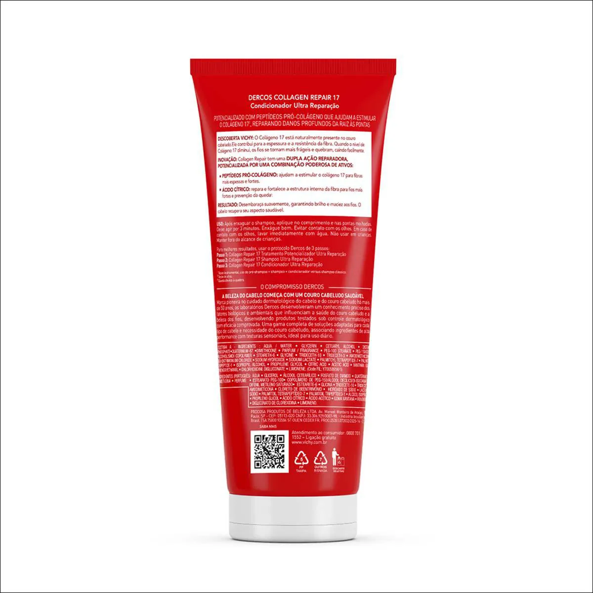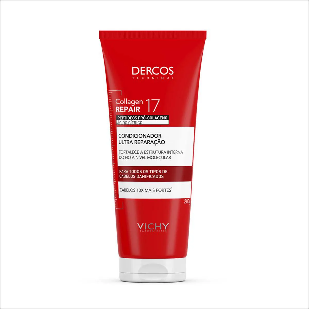 O Condicionador Ultra Reparação Vichy Dercos Collagen Repair 17 é um condicionador desenvolvido para reparar danos profundos dos fios, fortalecendo a fibra capilar desde a raiz até as pontas. Sua fórmula é potencializada por peptídeos pró-colágeno que estimulam o Colágeno 17, uma proteína essencial para a resistência e espessura dos cabelos.
