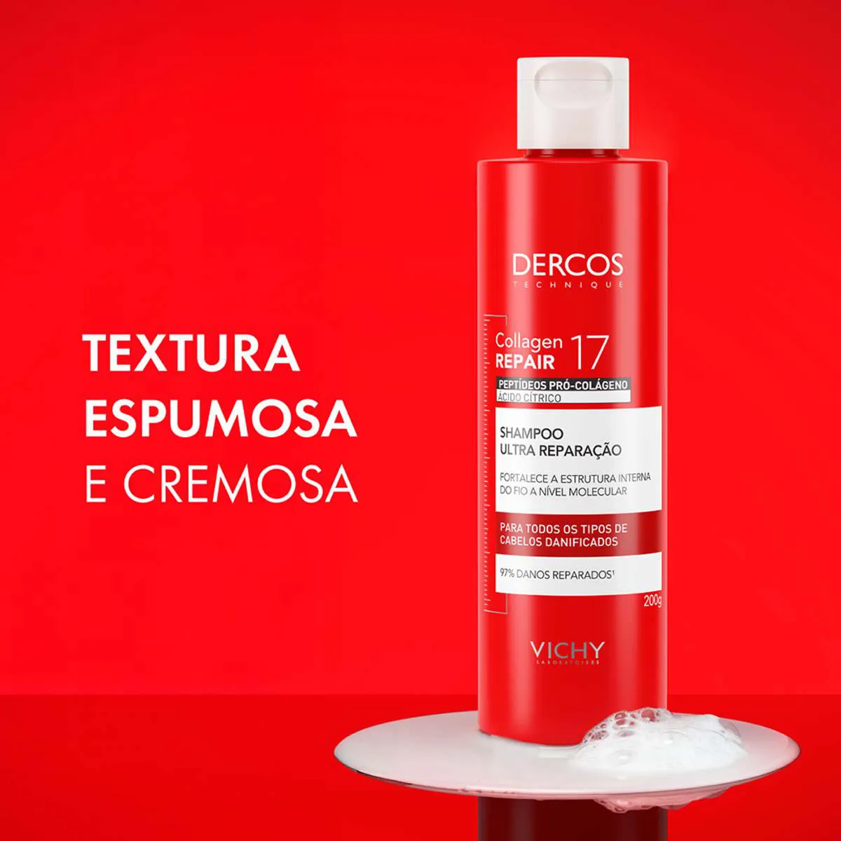 - Shampoo Ultra Reparação Vichy Dercos Collagen 17 fortalece os fios desde a raiz.
