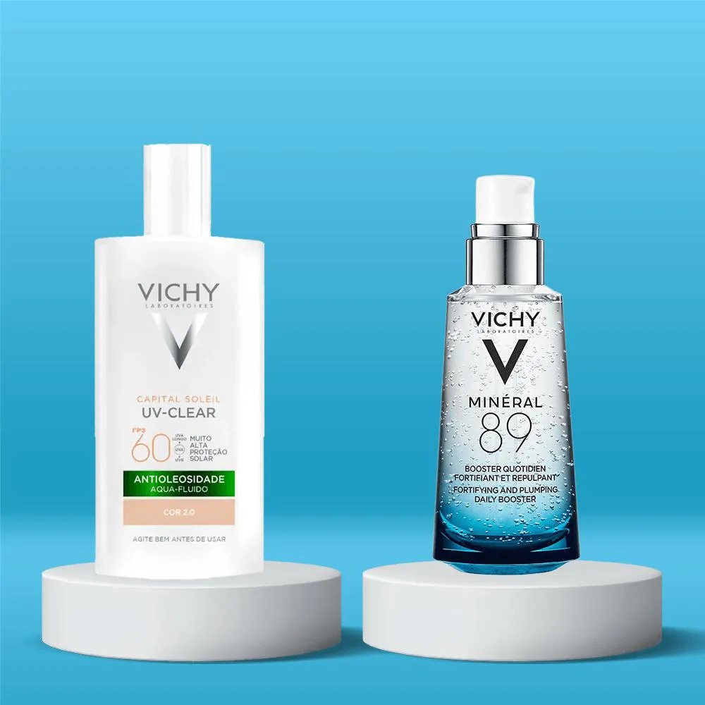 O Protetor Solar Facial Vichy Capital Soleil UV-Clear é enriquecido com Niacinamida e Ácido Salicílico, conhecidos por combater as imperfeições da acne e reduzir a oleosidade da pele. O Sérum Facial Fortalecedor Vichy Minéral 89 combina Ácido Hialurônico, um potente hidratante, com 89% de Água Vulcânica Mineralizante de Vichy, rica em minerais essenciais.