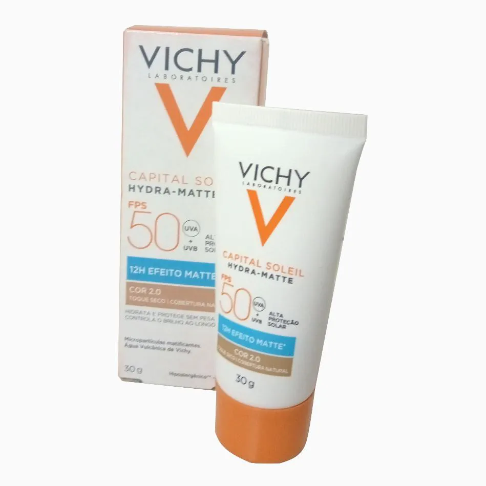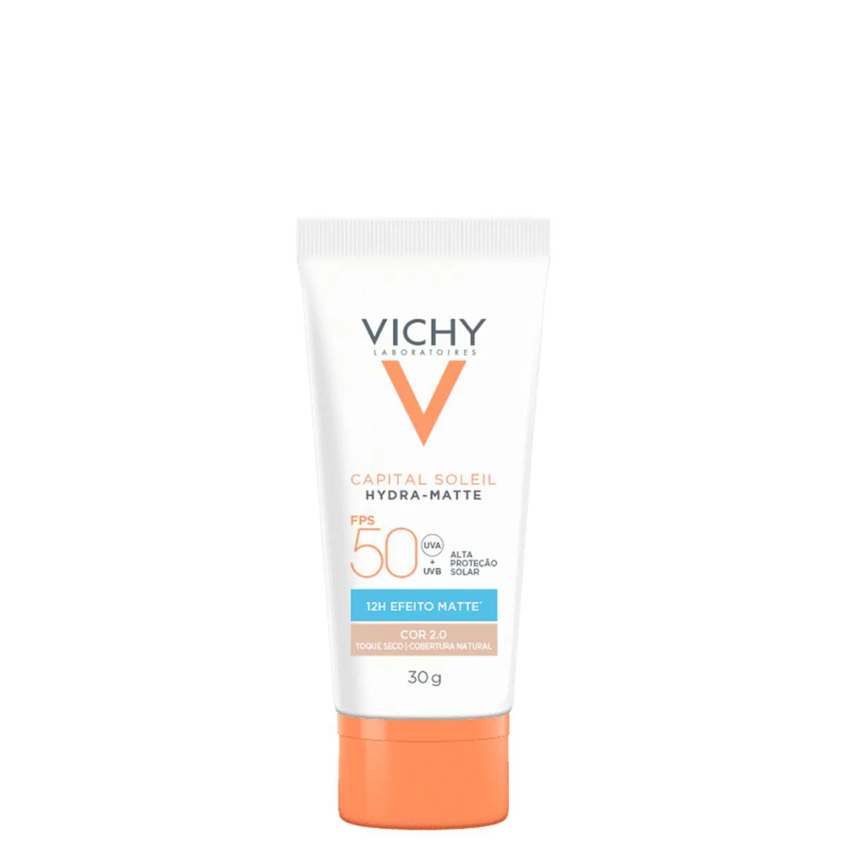 protetor solar com cor. Vichy V Capital Soileil Hydra- Matte FPS50 protege a pele dos raios UVA e UVB com efeito matte por até 12 horas. Ideal para a sua rotina diária de cuidados. O Protetor Solar Vichy V Capital Soileil Hydra- Matte FPS50 possui uma textura leve, com toque seco que elimina o brilho durante o dia. Além disso, sua composição tem água vulcânica Vichy que hidrata a cutis sem pesar.