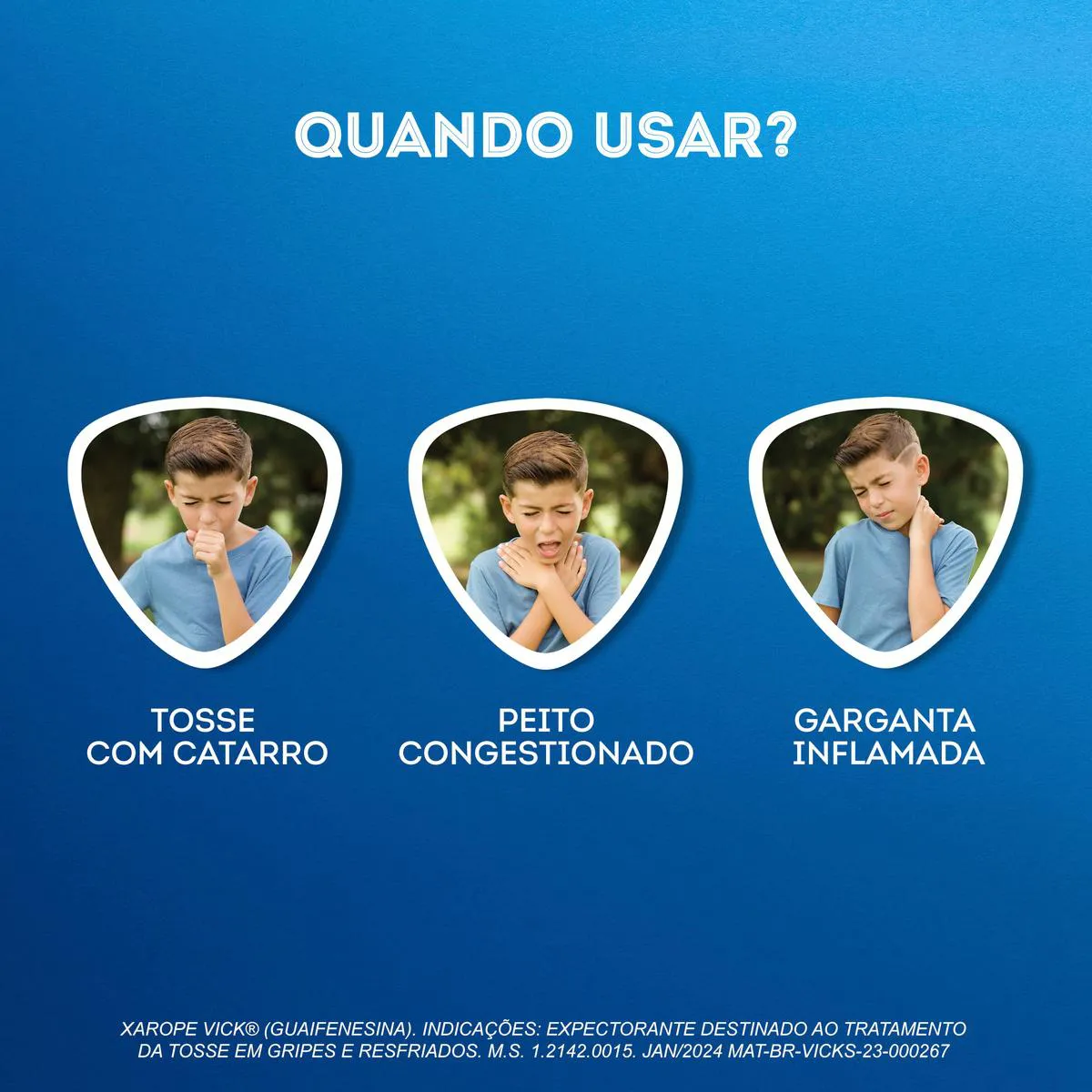 Xarope Vick® Mel é contraindicado para uso por pacientes alérgicos à guaifenesina ou aos demais componentes do medicamento.