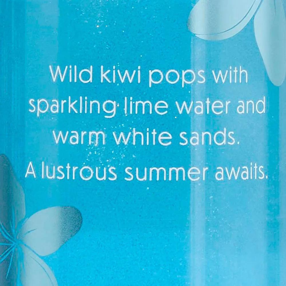 Eficácia: A fragrância combina kiwi selvagem e limão espumante para um frescor cítrico vibrante, com jasmim tropical e gardenia adicionando um toque floral sofisticado. O calor branco e o almíscar suave proporcionam um final quente e envolvente. As partículas de brilho criam um glow sutil, ideal para um visual radiante. Usuários destacam o aroma refrescante e o brilho delicado, perfeitos para dias ensolarados.